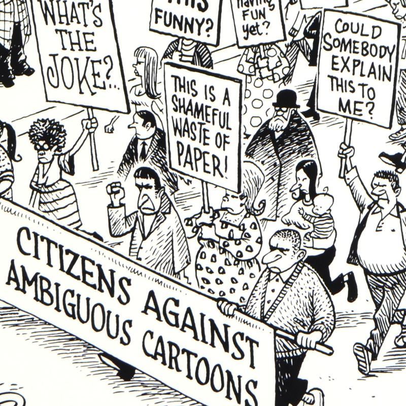 Enter a surreal and satirical world of twisted imagination and award winning creativity. "March Against Ambiguity" is a limited edition giclee on paper by Dan Piraro, creator of the critically acclaimed and award winning comic strip, Bizarro! This piece is framed, numbered and hand signed by the artist! Includes Certificate of Authenticity! Measures approx. 17" x 19" (with frame), 9.5" x 11.5" (image).