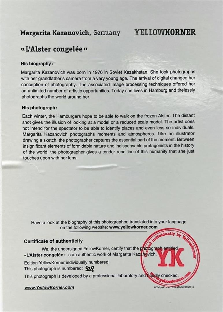 Margarita Kazanovic Germany LAlster Congelee YellowKorner Certified Photograph. Certificate of Authenticity from YellowKorner affixed to the back. Matted Dimensions 16"x20". Protected with Clear Mylar Sleeve.
