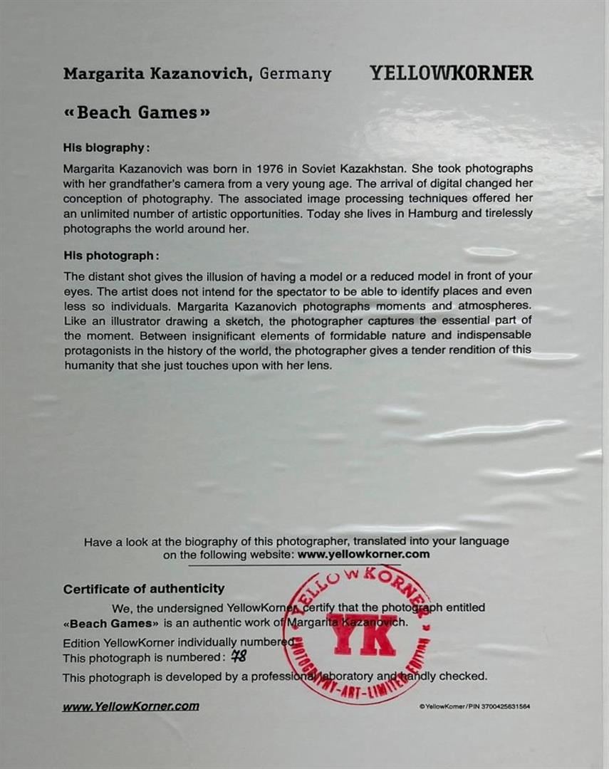 Margarita Kazanovich Germany Beach Games YellowKorner Certified Photograph. Certificate of Authenticity from YellowKorner affixed to the back. Matted Dimensions 16"x20". Protected with Clear Mylar Sleeve.