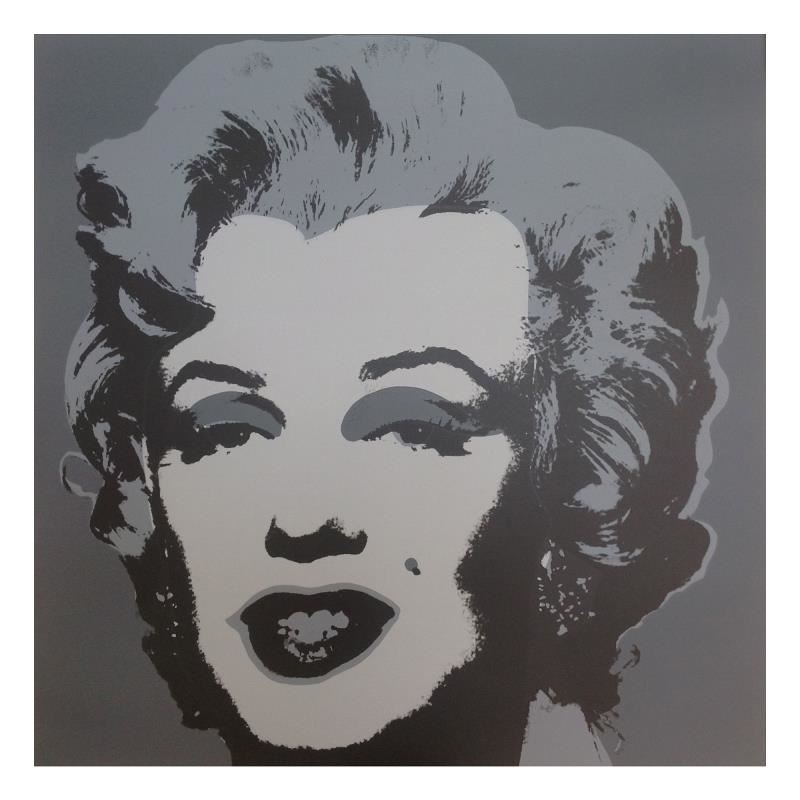 "Marilyn 11.24" is a silk screen print on paper (open edition) from Sunday B Morning featuring the works of Andy Warhol. The piece is stamped in blue on the back with "Published by Sunday B. Morning" and "fill in your own signature" and is accompanied by a certificate of authenticity. Measures approximately 36" x 36".