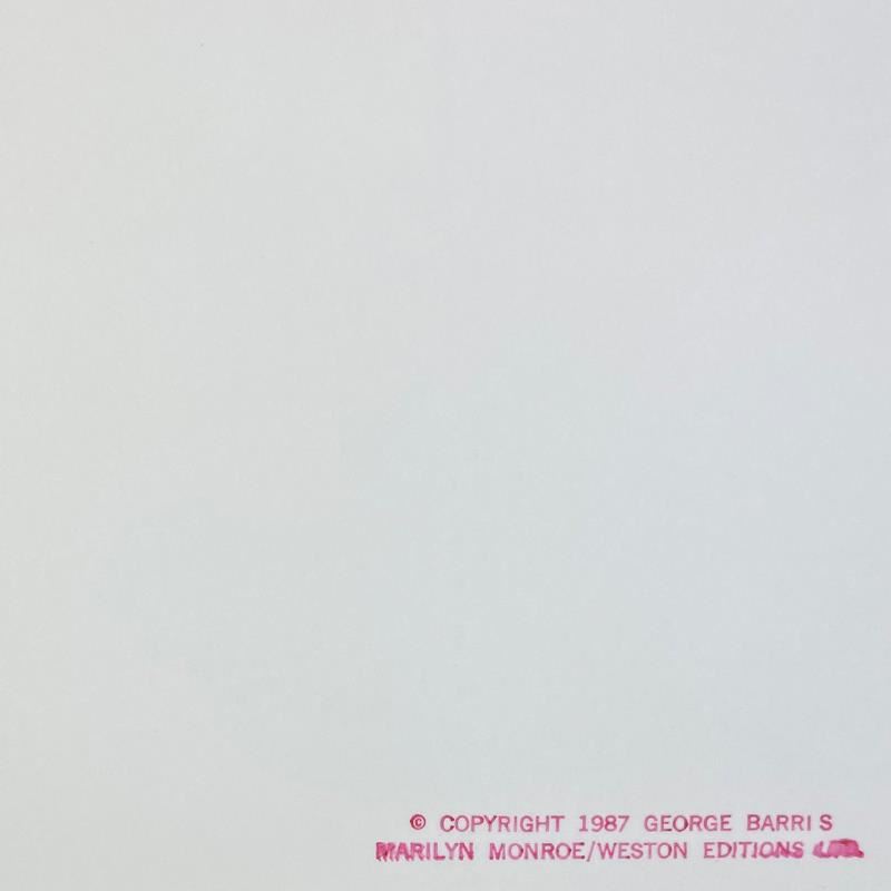 Marilyn Monroe by George Barris (1922-2016). "Marilyn Monroe: The Last Shoot" is a photograph printed from the original negative taken by George Barris (1922-2016). This photo is part of a series entitled "The Last Photos"; they were taken in 1962 just two weeks before Monroe's death and are considered the last photos ever taken of the icon. This framed piece is numbered inverso and hand signed by the photographer. This photo bears the Edward Weston copyright stamp inverso and Includes Letter of Authenticity. Measures approx. 19" x 22" (frame), 11" x 14" (image).