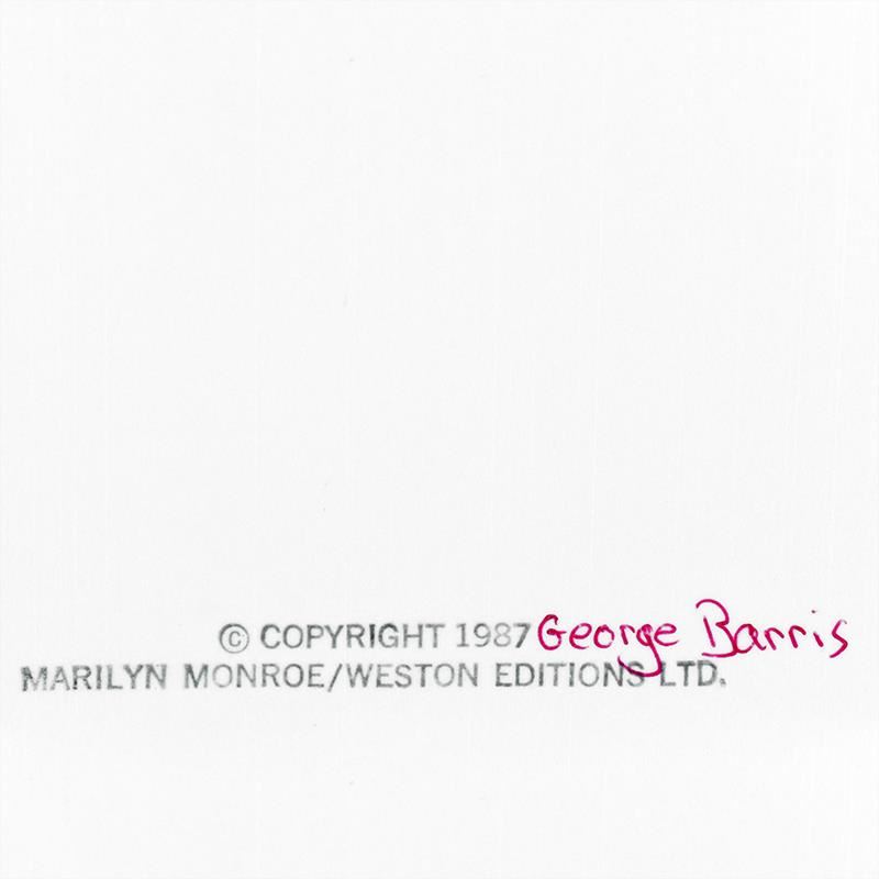 Marilyn Monroe by George Barris (1922-2016). "Marilyn Monroe: The Last Shoot" is a photograph printed from the original negative taken by George Barris (1922-2016). This photo is part of a series entitled "The Last Photos"; they were taken in 1962 just two weeks before Monroe's death and are considered the last photos ever taken of the icon. This piece is numbered inverso and hand signed by the photographer. This photo bears the Edward Weston copyright stamp inverso and includes Letter of Authenticity. Measures approx. 8" x 10" (image).