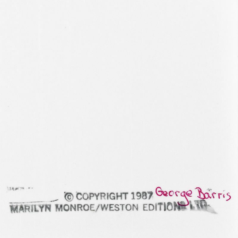 "Marilyn Monroe: The Last Shoot" is a photograph printed from the original negative taken by George Barris (1922-2016). This photo is part of a series entitled "The Last Photos"; they were taken in 1962 just two weeks before Monroe's death and are considered the last photos ever taken of the icon. This piece is numbered inverso and hand signed by the photographer. This photo bears the Edward Weston copyright stamp inverso and includes Letter of Authenticity. Measures approx. 10" x 8" (image).