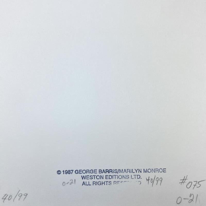 "Marilyn Monroe: The Last Shoot" is a photograph printed from the original negative taken by George Barris (1922-2016). This photo is part of a series entitled "The Last Photos"; they were taken in 1962 just two weeks before Monroe's death and are considered the last photos ever taken of the icon. This framed piece is numbered inverso and hand signed by the photographer. This photo bears the Edward Weston copyright stamp inverso and Includes Letter of Authenticity. Measures approx. 19" x 22" (frame), 10" x 13" (image).
