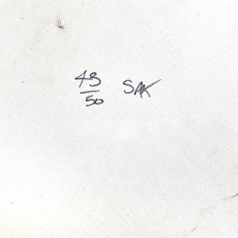 "Marilyn" is a hand painted, hand pulled unique variation silkscreen on canvas by Andy Warhol protege, Steve Kaufman (1960-2010). This piece is numbered 43/50 and hand signed inverso by the artist. Includes Letter of Authenticity. Measures approx. 14" x 14" (image). As is common with Kaufman's works, this piece may have perceived minor flaws, but is in overall good condition.