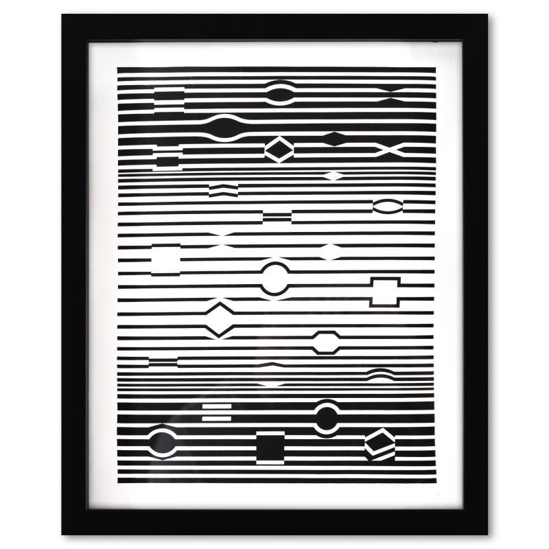 "Markab de la série Ondulatoires" is a heliogravure print on paper, published in 1973, by Victor Vasarely (1908-1997). This piece comes custom framed, with a letter of authenticity and with a 1976 Vasarely paperback. Measures approx. 12.5" x 15" (frame), 10" x 13" (image).