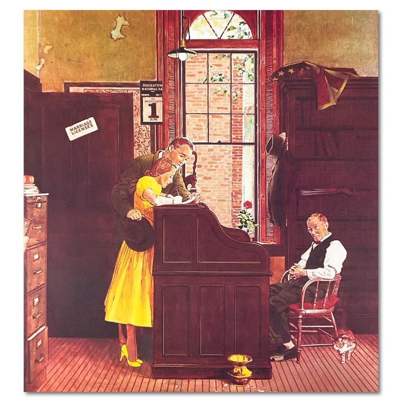 "Marriage License" is a limited edition offset lithograph on paper by Norman Rockwell (1894-1978), numbered inverso. Includes Letter of Authenticity. Measures approx. 21" x 23" (image). ** Please note: There may be minor imperfections on the paper; particularly on the corners and edges but these imperfections will be concealed when the piece is framed. **