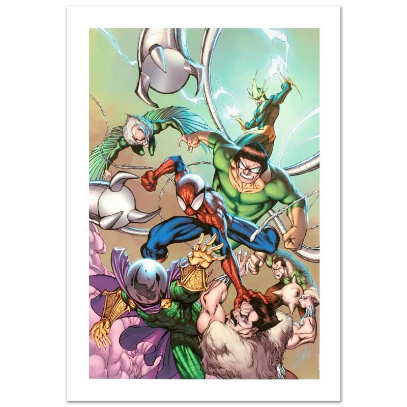 A piece of comic book history, this limited edition, from original art by Cameron Stewart, depicts an epic battle. Canadian artist Cameron Stewart won the "Outstanding WebComic Creator/Creative Team" Shuster Award for his work on Sin Titulo, and has also done work for both Marvel and DC Comics. "Marvel Adventures: Spider-Man #17" is a limited edition giclee on canvas by Cameron Stewart presented by Marvel Comics, numbered and hand signed by the great Stan Lee! Includes Certificate of Authenticity! Measures approx. 18" x 27" (image).