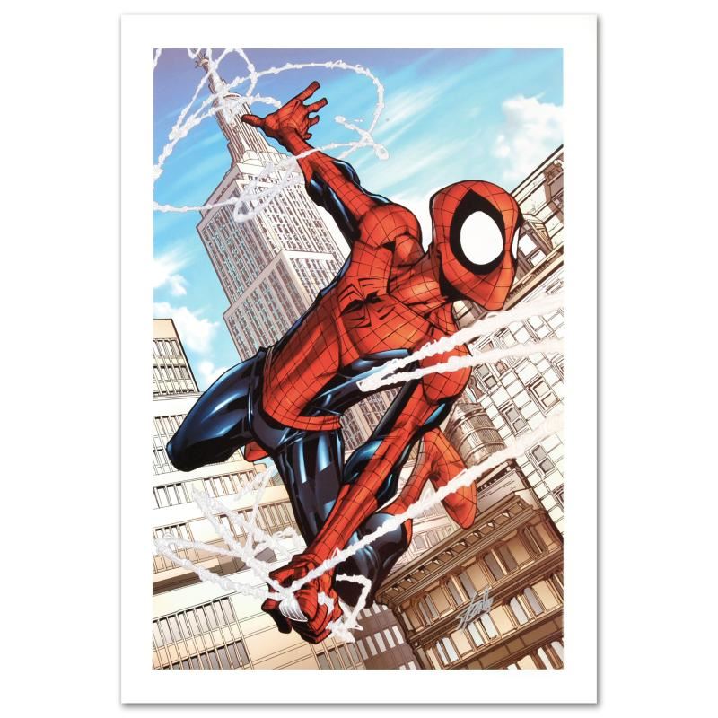 A piece of comic book history, this limited edition, from original art by Patrick Scherberger, depicts a heroic Spider-Man. Patrick Scherberger is an American comic book penciller, known for his work on the book Marvel Adventures: Spider-Man. Scherberger's career began when he entered and won an internet competition called "Comic Book Idol" in 2004. During the competition he was contacted by Joe Quesada to do a formal try-out for Marvel Comics and, as a result of this, was soon chosen to pencil Marvel Adventures: Spider-Man. "Marvel Adventures: Spider-Man #50" is a limited edition giclee on canvas by Patrick Scherberger presented by Marvel Comics, numbered and hand signed by the great Stan Lee! Includes Certificate of Authenticity! Measures approx. 18" x 27" (image).