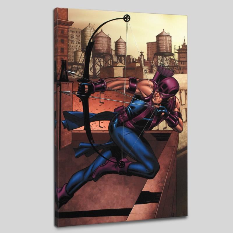 A piece of comic book history, this limited edition, from original art by David Williams, depicts a heroic Hawkeye. David Williams has done cover art for such Marvel franchises as the Avengers, She-Hulk, and Wolverine. "Marvel Adventures Super Heroes #14" is a limited edition numbered giclee on canvas by David Williams presented by Marvel Comics. This piece comes gallery wrapped and ready to hang. Includes Certificate of Authenticity! Measure approx. 18" x 27" (image).