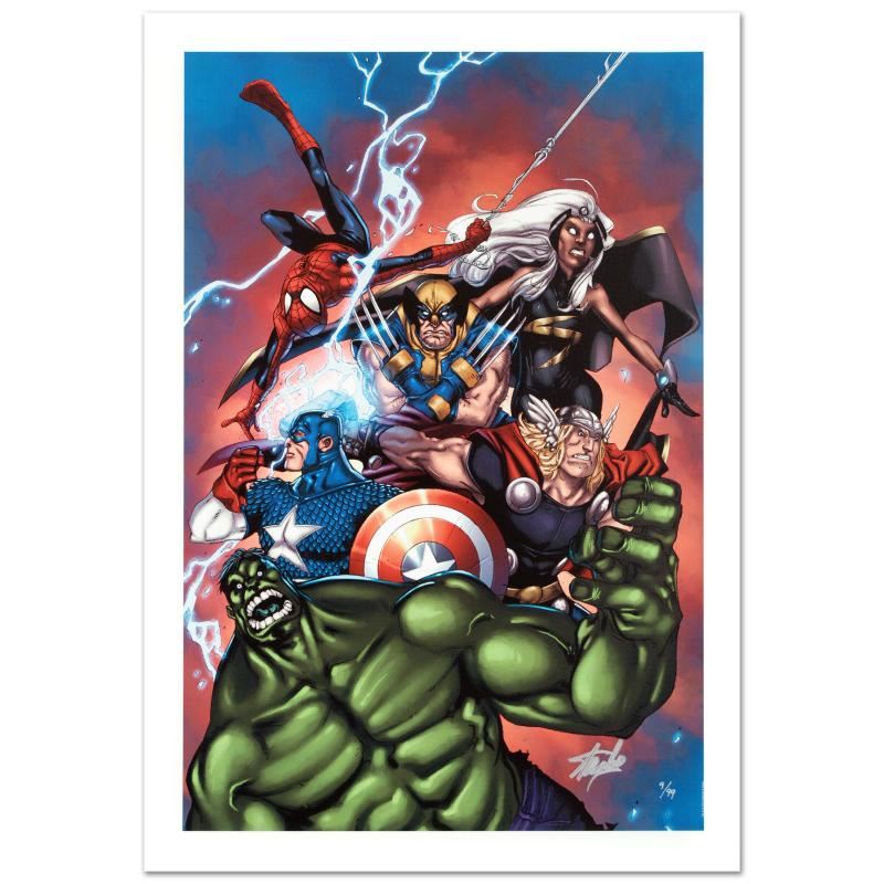 A piece of comic book history, this limited edition, from original art by Ig Guara, depicts the classic Avengers. Brazilian artist Ig Guara was first known for his fantasy work. He was soon asked to be a penciller for Marvel's Marvel Adventures series. "Marvel Adventures: The Avengers #36" is a limited edition giclee on canvas by Ig Guara presented by Marvel Comics, numbered and hand signed by the great Stan Lee! Includes Certificate of Authenticity! Measures approx. 18" x 27" (image).