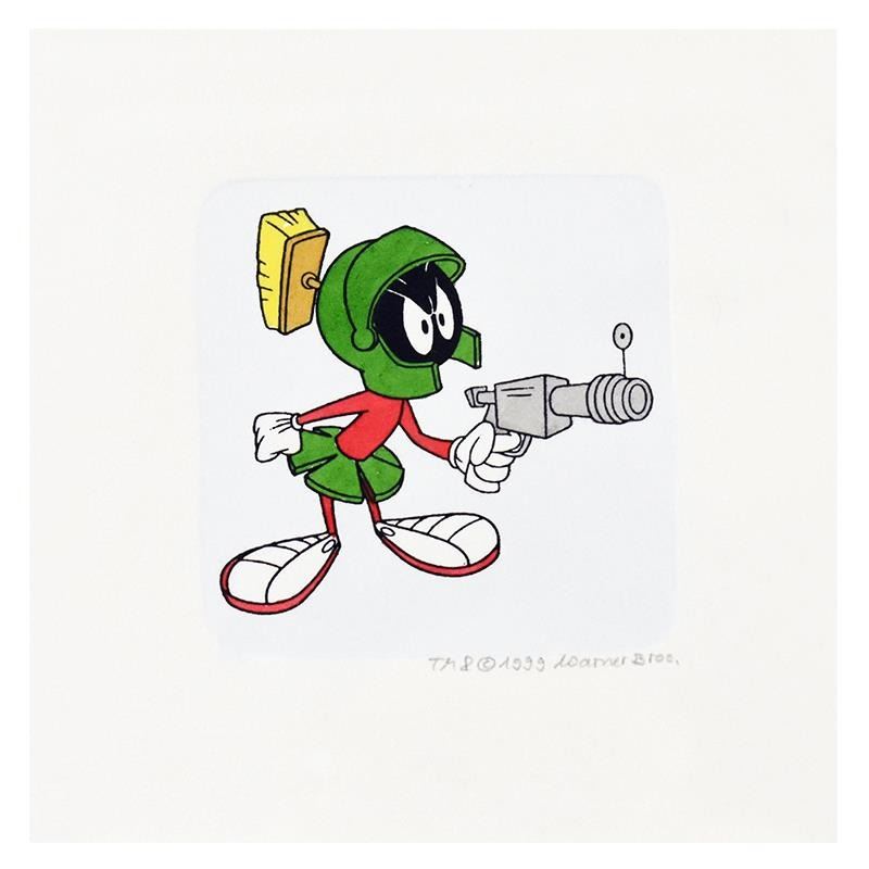"Marvin the Martian" is a limited edition etching on paper with hand-tinted coloring from Warner Bros, numbered and dated 1999. This piece comes framed. Measures approximately 14" x 14" (frame), 2.5" x 2.5" (image).