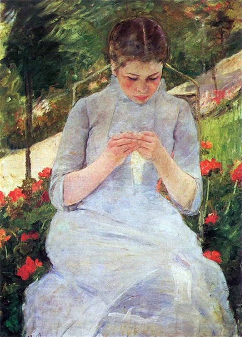 Artist: Mary Stevenson Cassatt (b. 1844 - 1926) Title: Young Woman Sewing In The Garden Medium: Fine Art Reproduction Giclee on Canvas Image Size: Approximately 20 inches x 14.25 inches Unframed on Unstretched Canvas Birography: Born on May 22, 1844, in Allegheny City, Pennsylvania, Mary Cassatt was one of the leading artists in the Impressionist movement of the later part of the 1800s. Moving to Paris, her home for the rest of her life, she was befriended by Edgar Degas. After 1910, her increasingly poor eyesight virtually put an end to her serious painting, and she died in 1926.