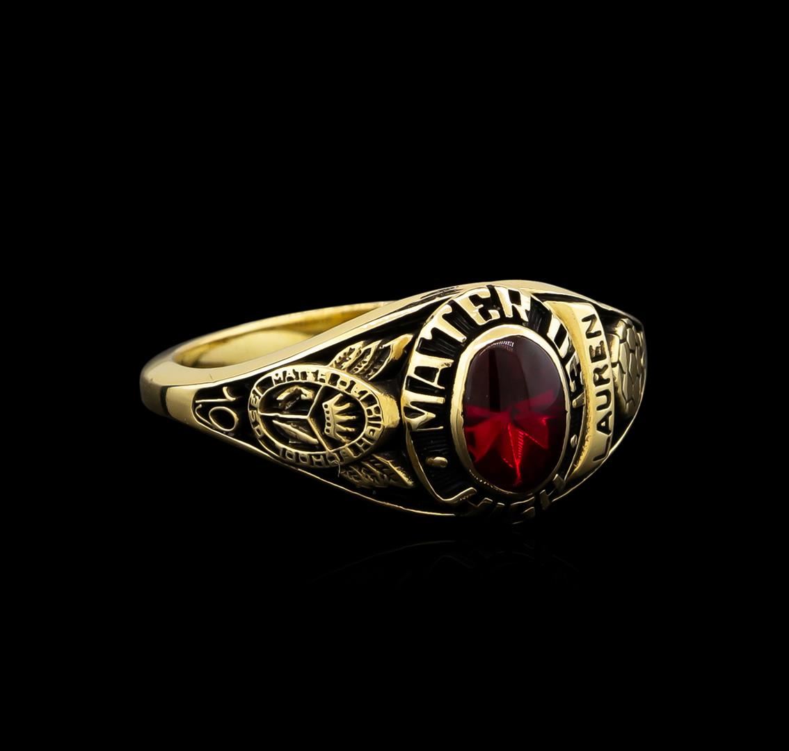 One Mater Dei High School ring featuring: 10KT yellow gold weighing approximately 4.17 grams containing one ruby.