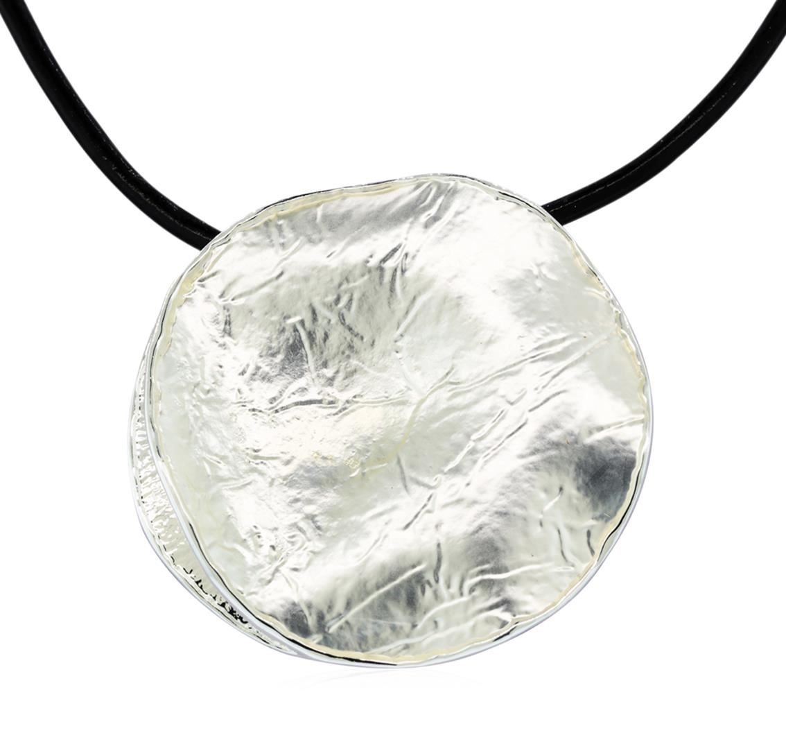 High end designer jewelry. Matte Hand Painted Medallion Necklace - Rhodium Plated. Rhodium Plated/3" Ext Clasp/ Leather Cord. Silver/ Black. 16inches. Total Weight: 21.8 grams.