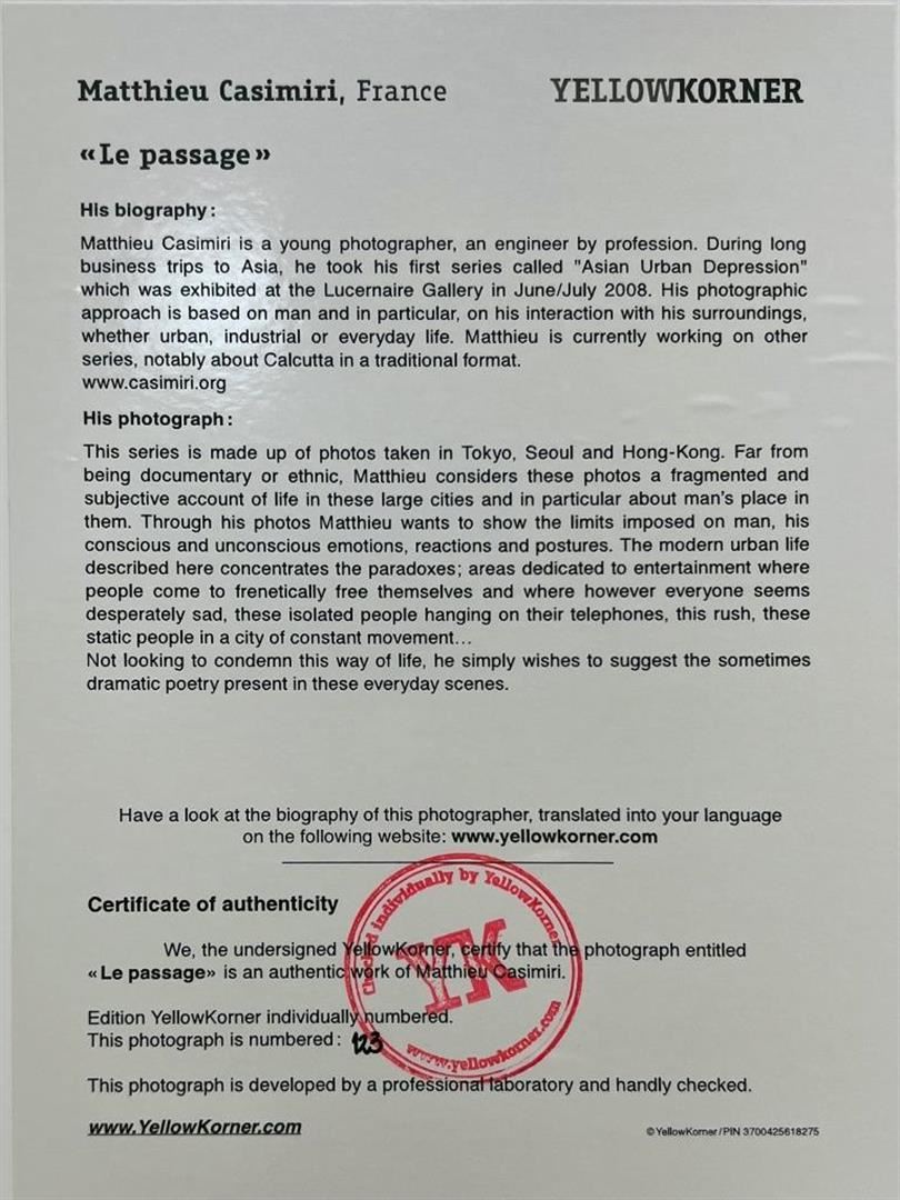 Matthieu Casimiri France Le Passage YellowKorner Certified Photograph. Certificate of Authenticity from YellowKorner affixed to the back. Matted Dimensions 16"x20". Protected with Clear Mylar Sleeve.