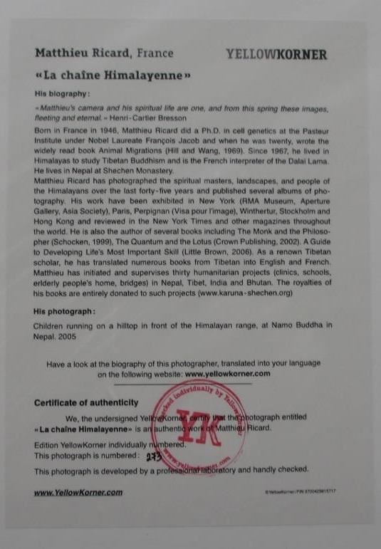La chaine Himalayenne Certified Photograph, Matthieu Richard YellowKorner Certified Photograph. Certificate of Authenticity from YellowKorner affixed to the back. Matted Dimensions 16"x20". Protected with Clear Mylar Sleeve.