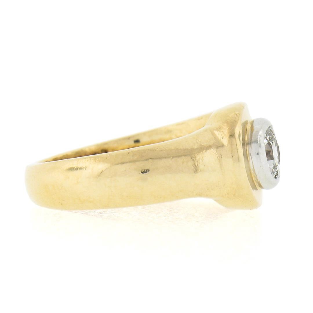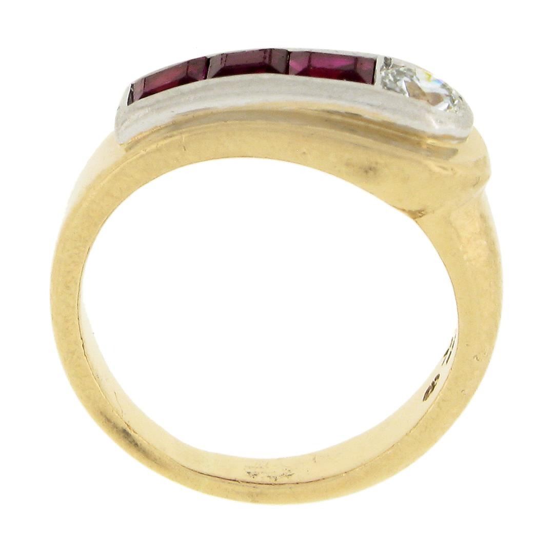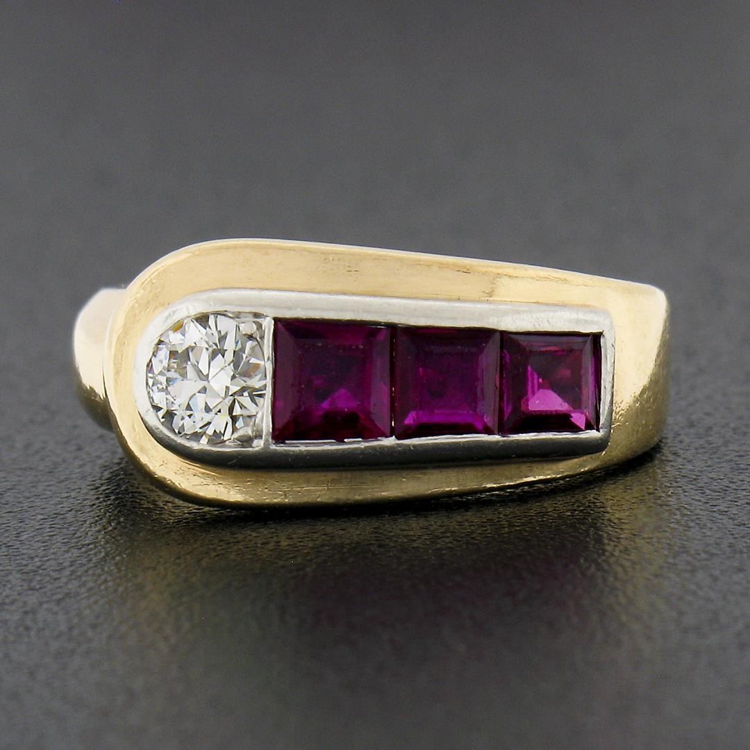 A vintage solid 14k yellow gold & platinum ring, with 1 old transitional cut natural diamnod (F - VS1 ; 0.27ct), and 3 square step cut natural rubies (0.60ctw). The ring is size 3.0, weighs a total of 5.08 grams, and measures 7.8mm wide.