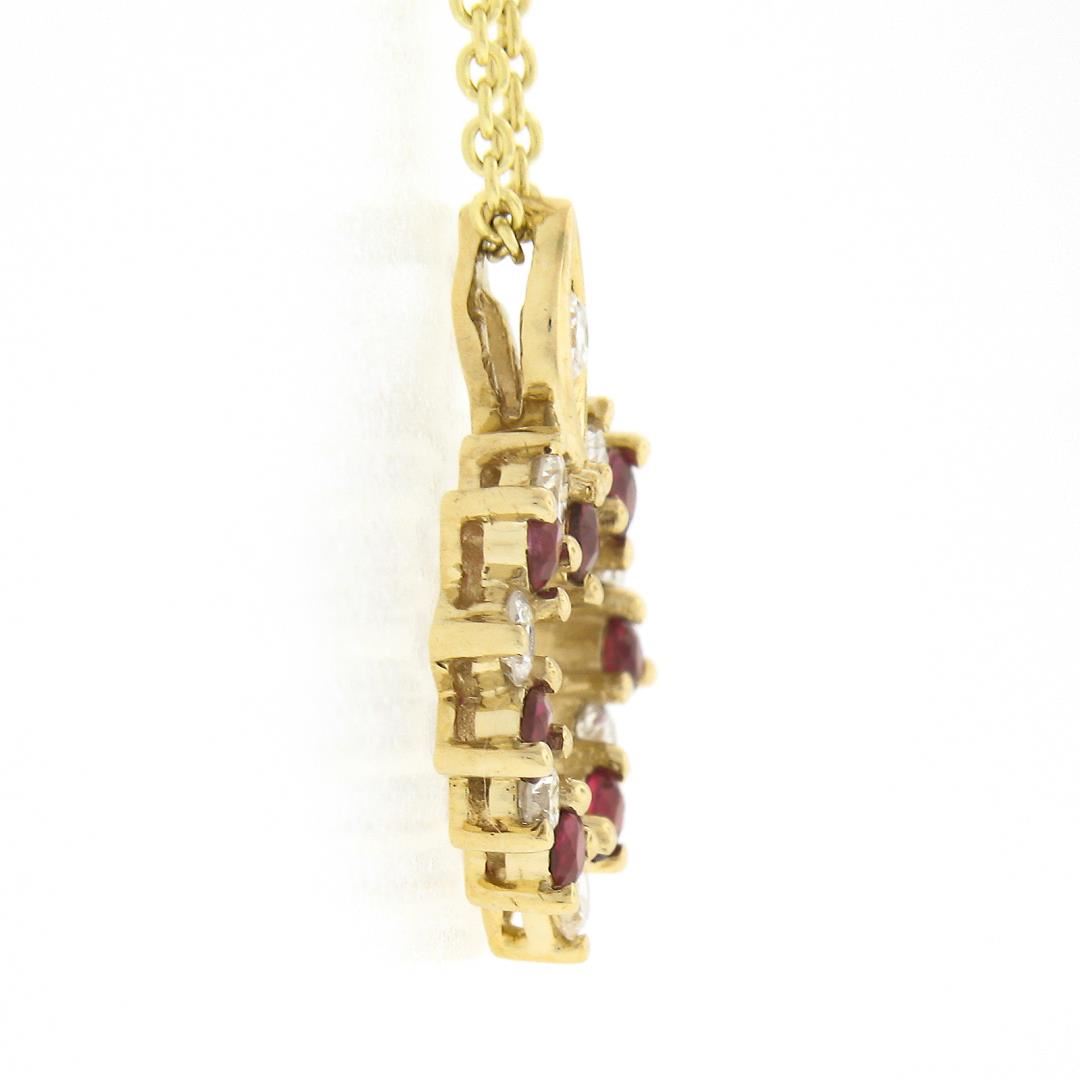 A solid 14k yellow gold heart pendant necklace by Mayors, with 8 round brillian cut natural diamonds (F/G - VS1/VS2 ; 0.24ctw), and 7 round brilliant cut natural rubies (0.35ctw). 16 inch cable link chain, 1.10 grams total weight, pendant measures 16.55x12.5mm.