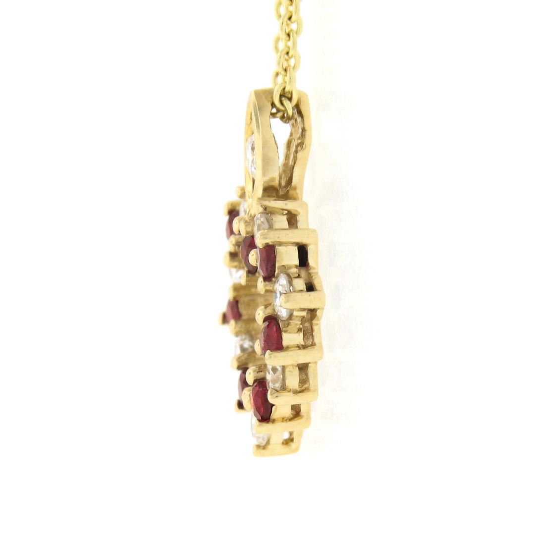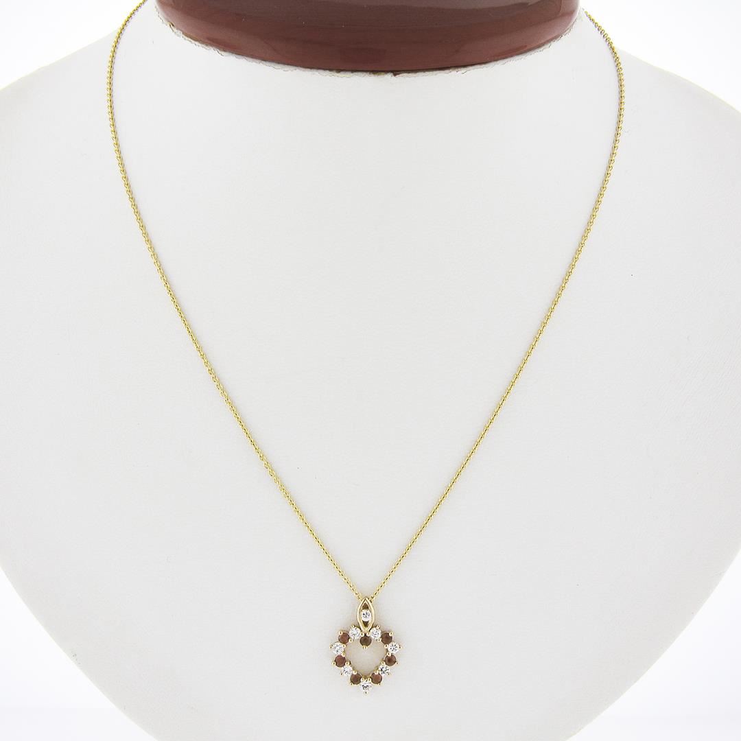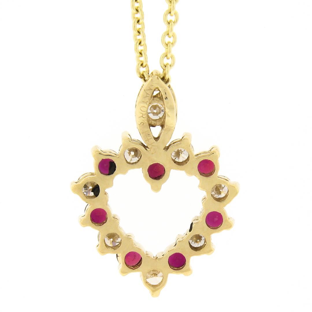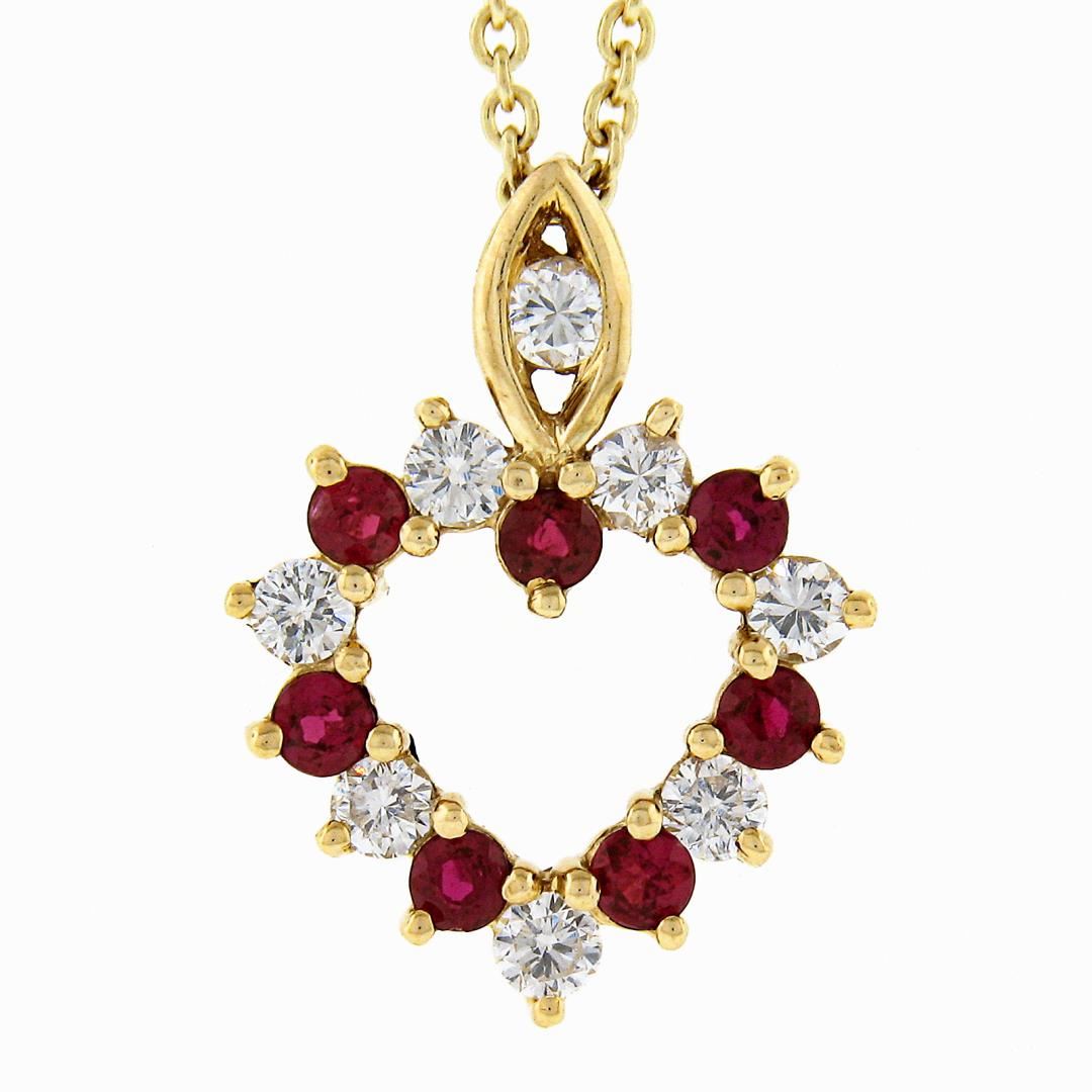 A solid 14k yellow gold heart pendant necklace by Mayors, with 8 round brillian cut natural diamonds (F/G - VS1/VS2 ; 0.24ctw), and 7 round brilliant cut natural rubies (0.35ctw). 16 inch cable link chain, 1.10 grams total weight, pendant measures 16.55x12.5mm.