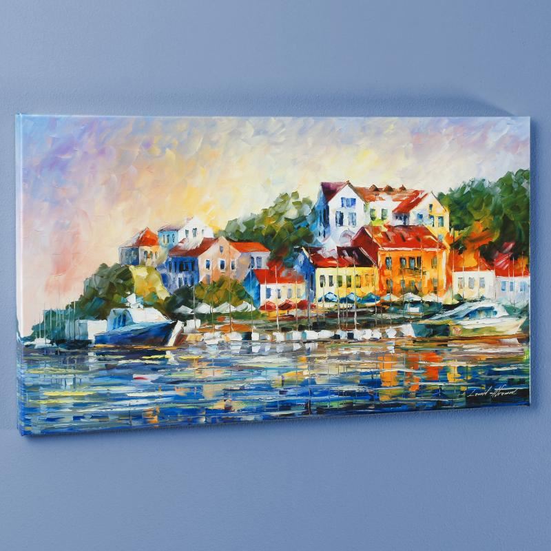 Leonid Afremov's masterful use of color and texture make his paintings unique collectibles that are sure to brighten any wall. "Mediterranean Noon" is a limited edition giclee on stretched canvas, numbered in verso and bears Afremov's authorized signature. This piece comes gallery wrapped. Includes Certificate of Authenticity! Measures approx. 27.5" x 16" (image).