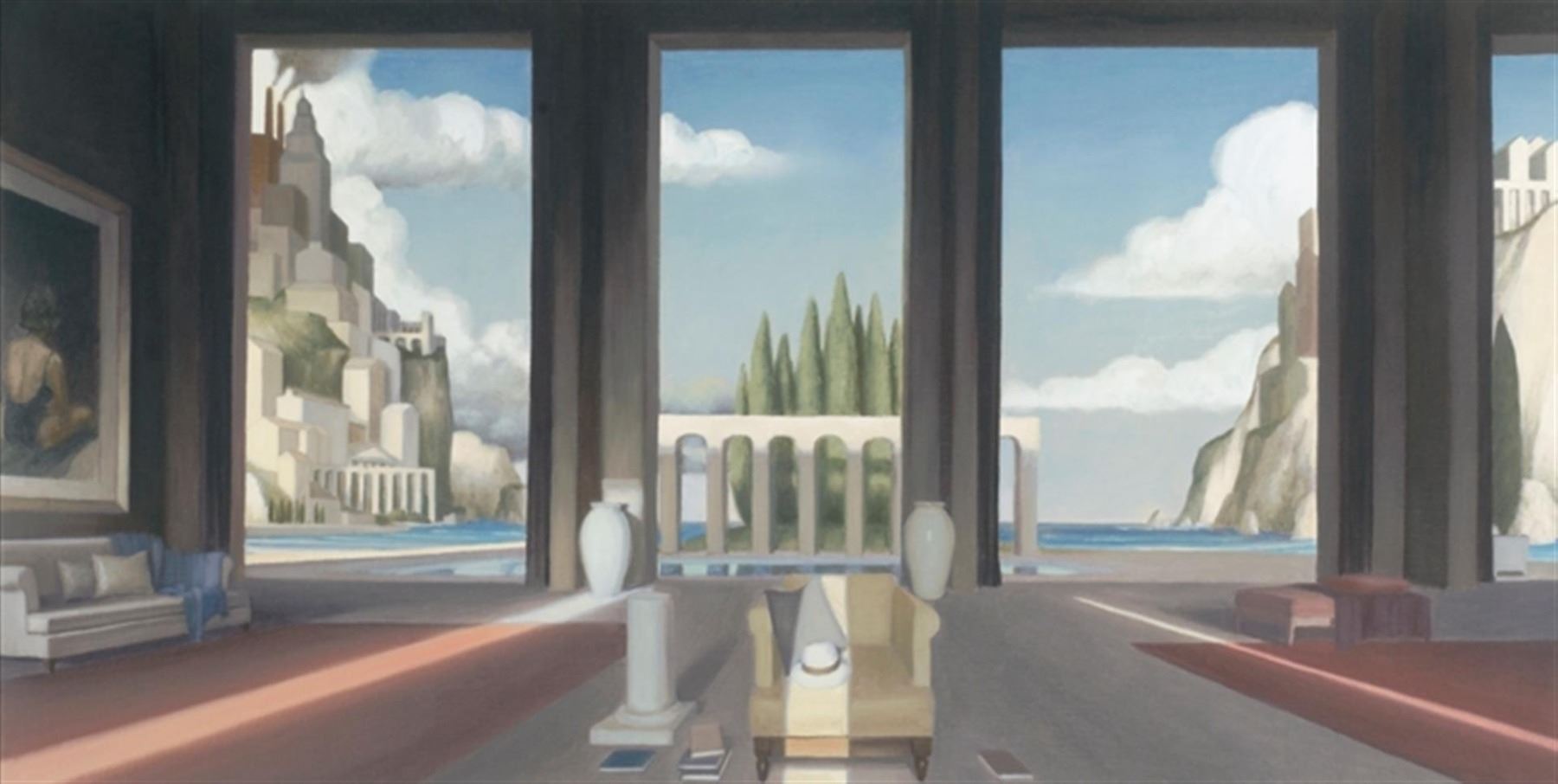 Contemporary French artist, Thierry Mysius, displays a large, contemporary room overlooking the Mediterranean Sea in this oil on canvas. The painting measures 15.75 x 31.5; framed image measures approx. 27.75 x 43.5.