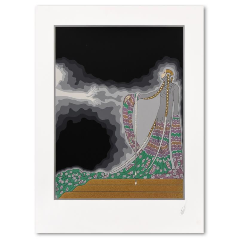 "Melisande" is a limited edition serigraph from an AP edition on paper, hand signed by Erte (1892-1990). Measures approx. 22" x 30" (border), 17" x 23" (image). Due to the age of this piece there is minor staining on top-right edge of the border that may be concealed when framed.