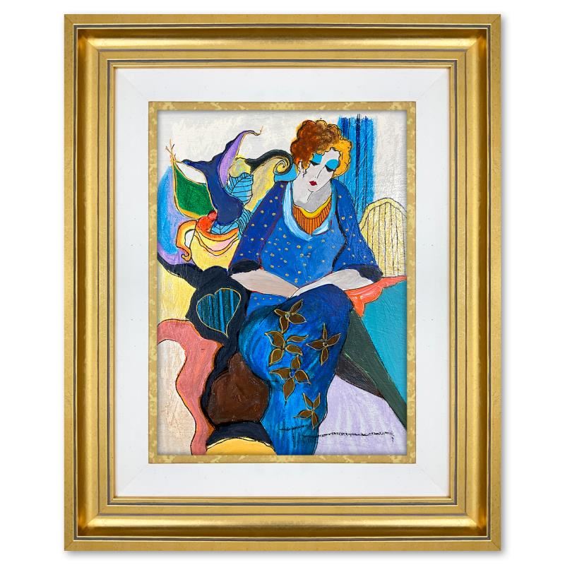 Memorie is a one-of-a-kind mixed media over paint on wood by Itzchak Tarkay (1935-2012), hand signed by the artist. This piece comes custom framed. Includes Letter of Authenticity. Measures approx. 19.5 x 16.5 (frame), 11.5 x 8.5 (image).