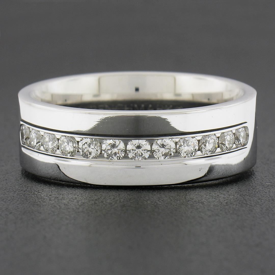 A solid 14k white gold band ring, with 12 round cut natural diamonds (F/G - VS1/VS2 ; 0.60ctw). The ring is size 12.5, weighs a total of 12.45 grams, and measures 7.9mm wide.