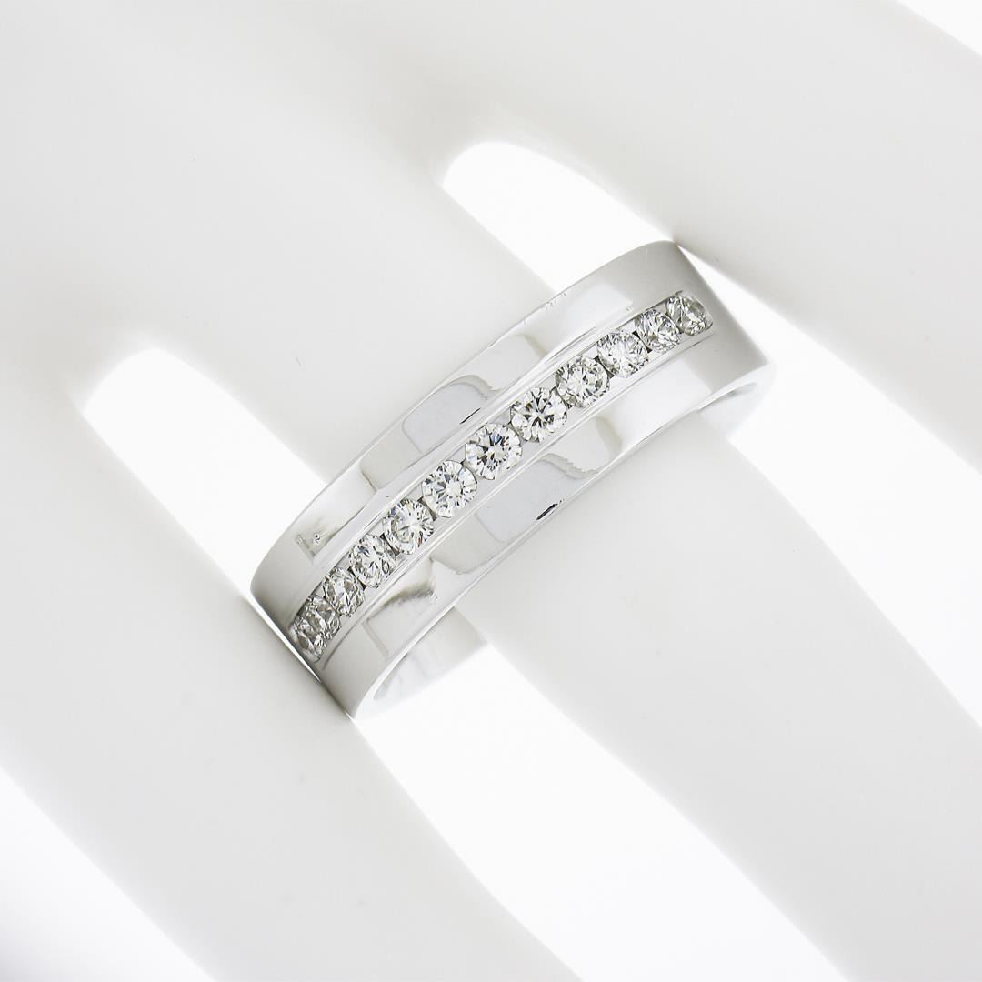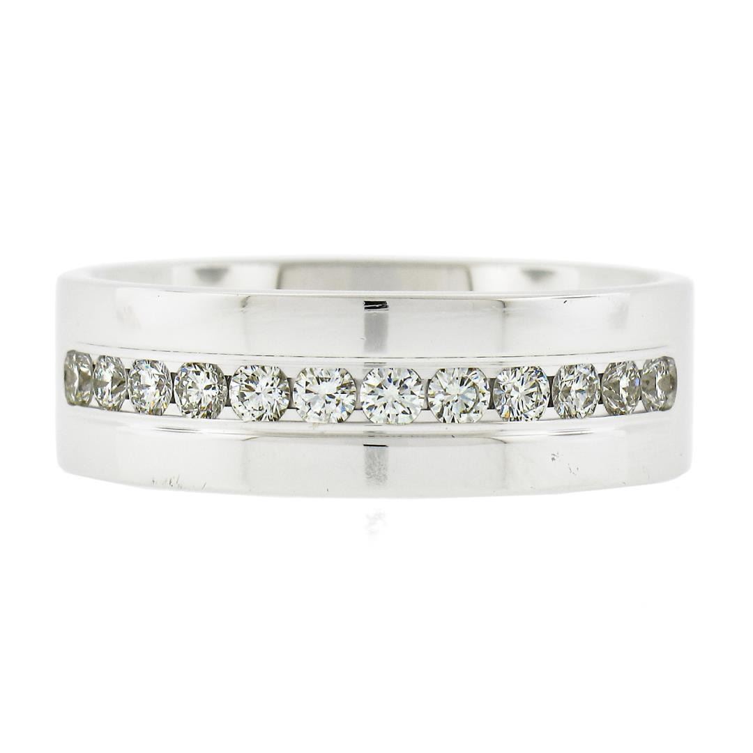 A solid 14k white gold band ring, with 12 round cut natural diamonds (F/G - VS1/VS2 ; 0.60ctw). The ring is size 12.5, weighs a total of 12.45 grams, and measures 7.9mm wide.