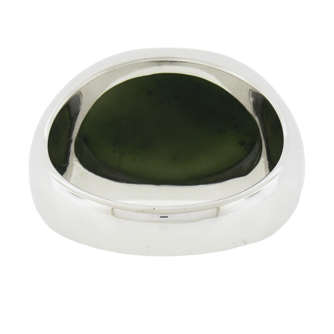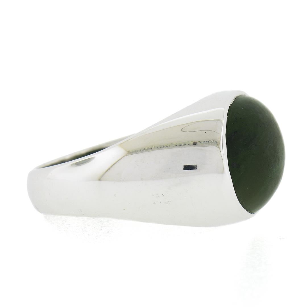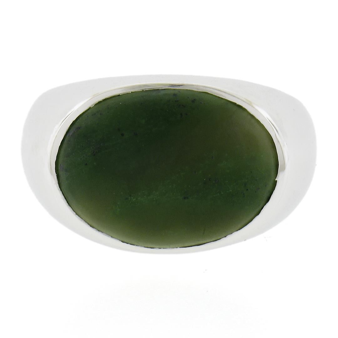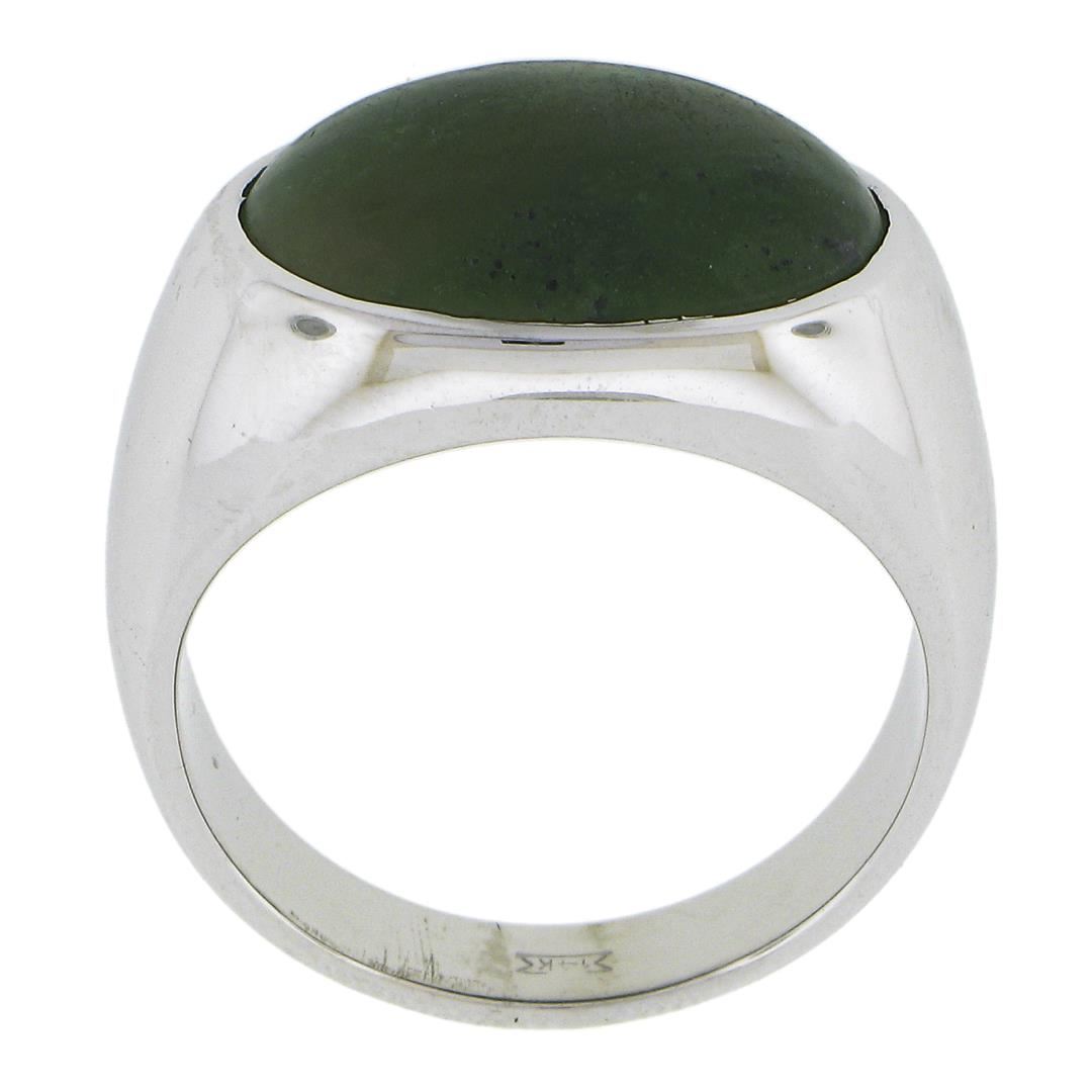 A solid 14k white gold band ring, with 1 oval cabochon cut natural nephrite jade (17.4x12.8mm). The ring is size 11.0, weighs a total of 15.14 grams, and measures 14.5mm wide.