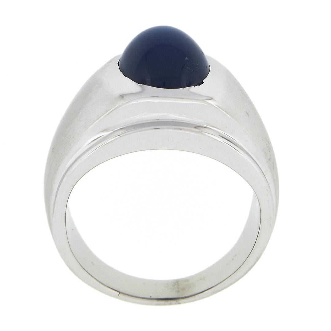 A solid 14k white gold men's ring, with 1 oval cabochon cut natural lindy star sapphire (10.6x8.6mm). The ring is size 8.0, weighs a total of 12.62 grams, and measures 14.4mm wide.