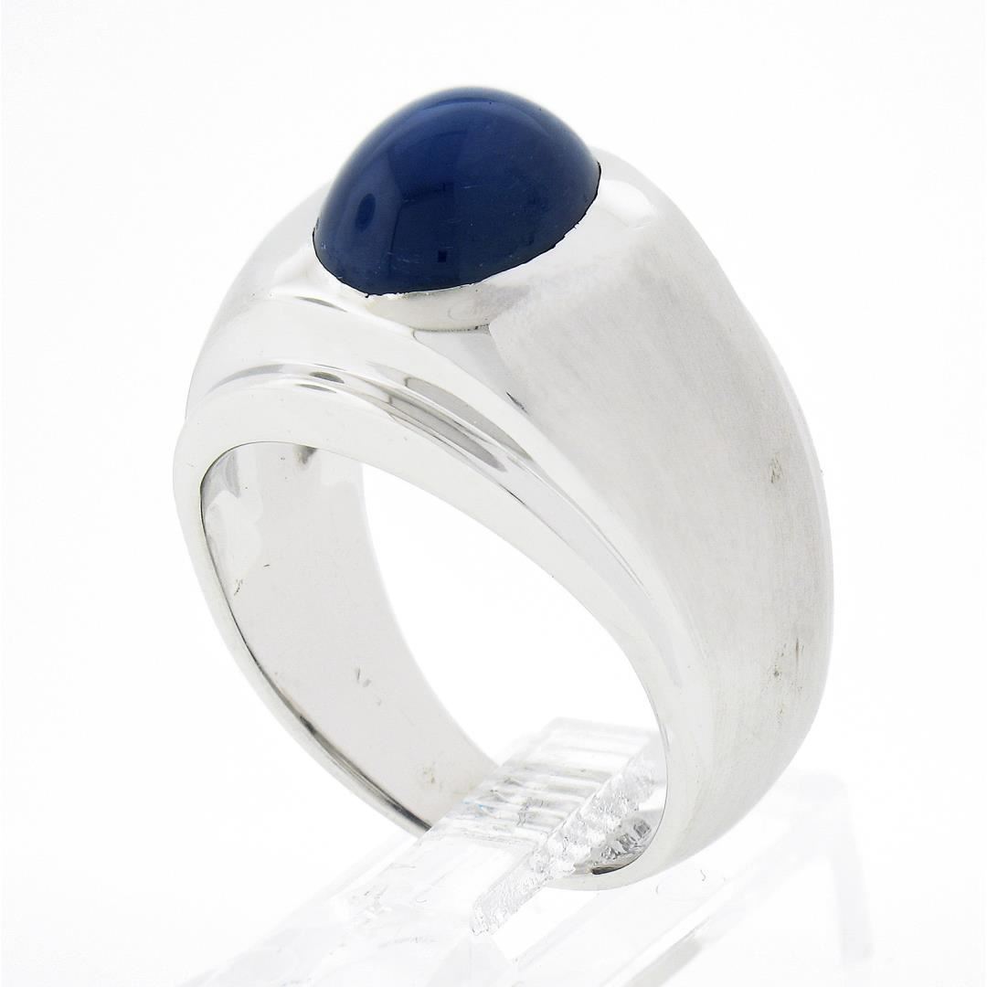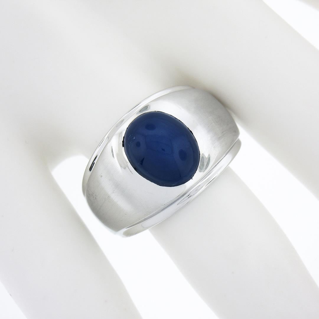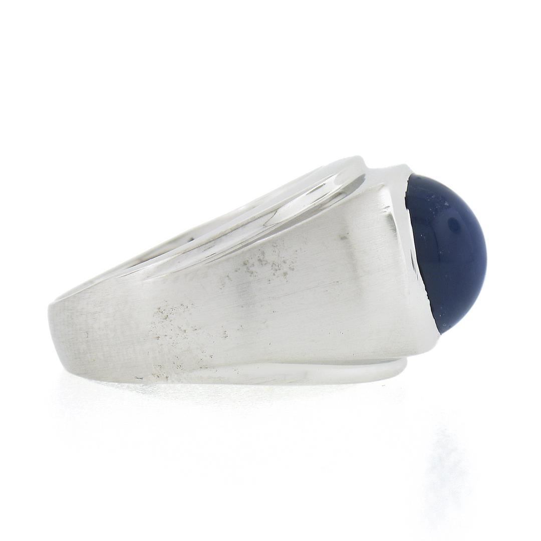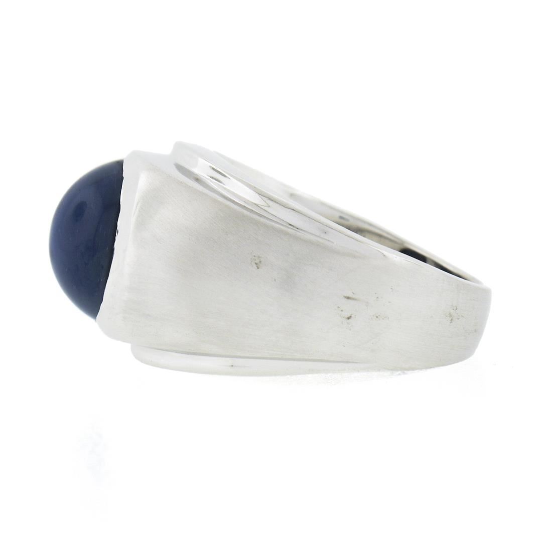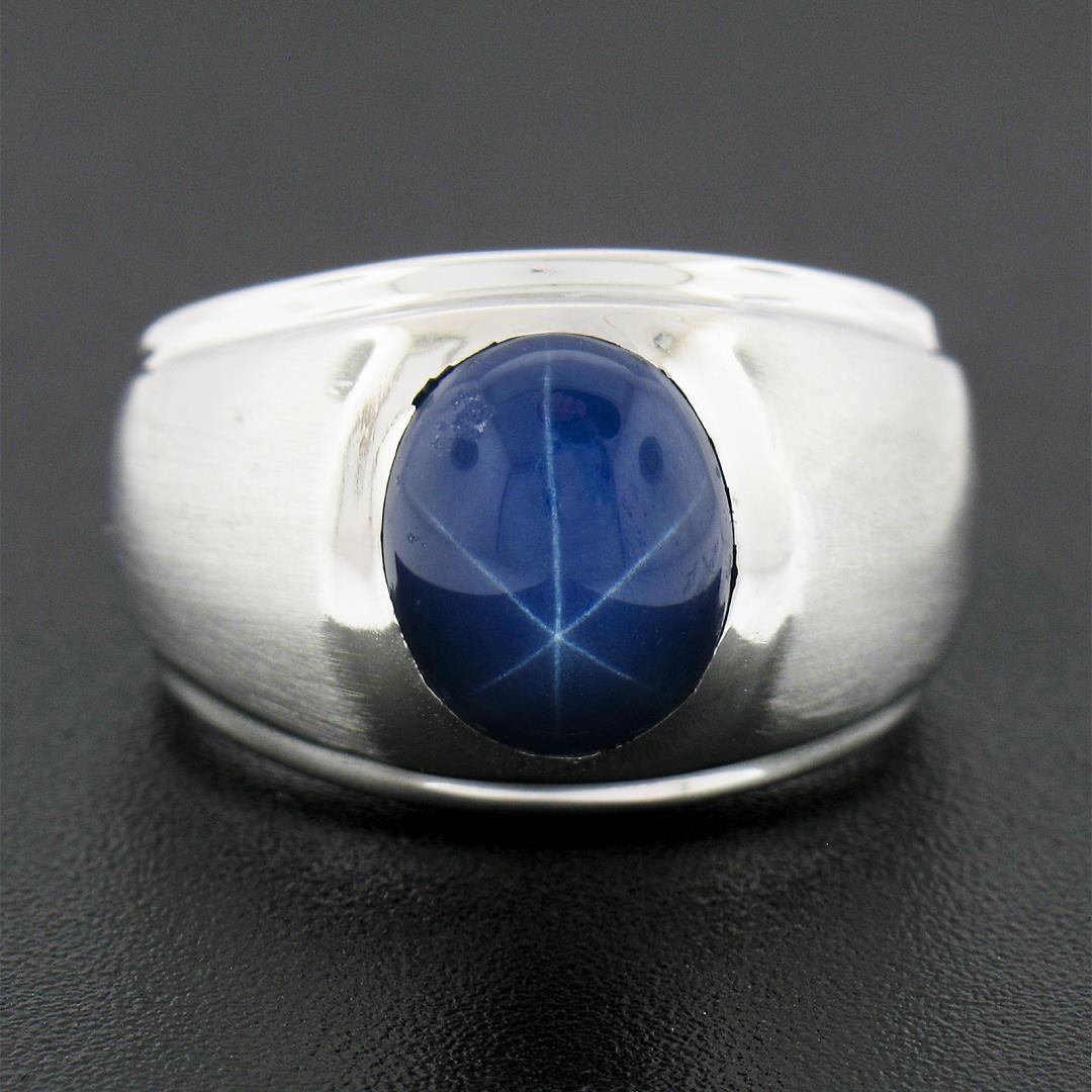 A solid 14k white gold men's ring, with 1 oval cabochon cut natural lindy star sapphire (10.6x8.6mm). The ring is size 8.0, weighs a total of 12.62 grams, and measures 14.4mm wide.