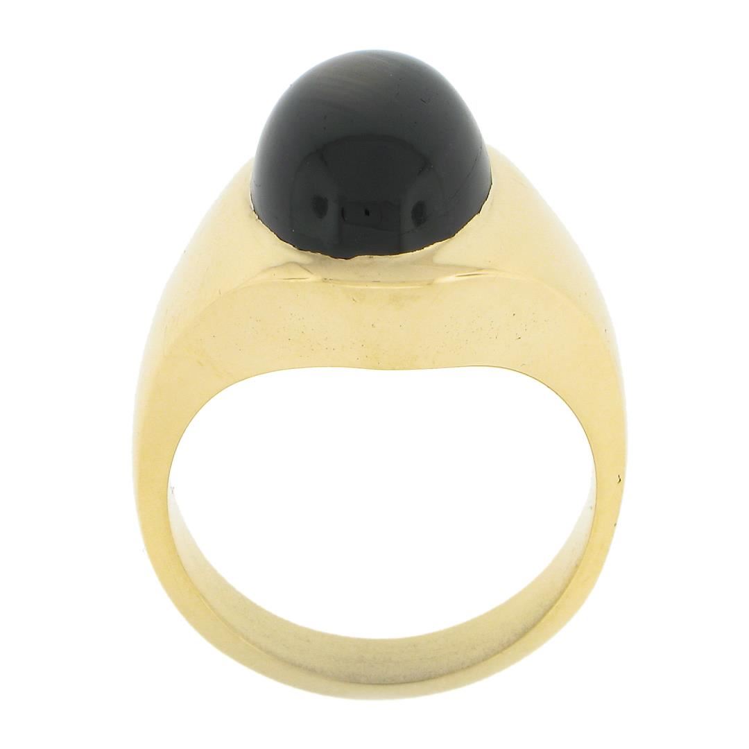 A solid 14k yellow gold solitaire ring, with 1 oval cabochon cut natural brown star sapphire (11.85ct). The ring is size 9.0, weighs a total of 15.69 grams, and measures 16.6mm wide.