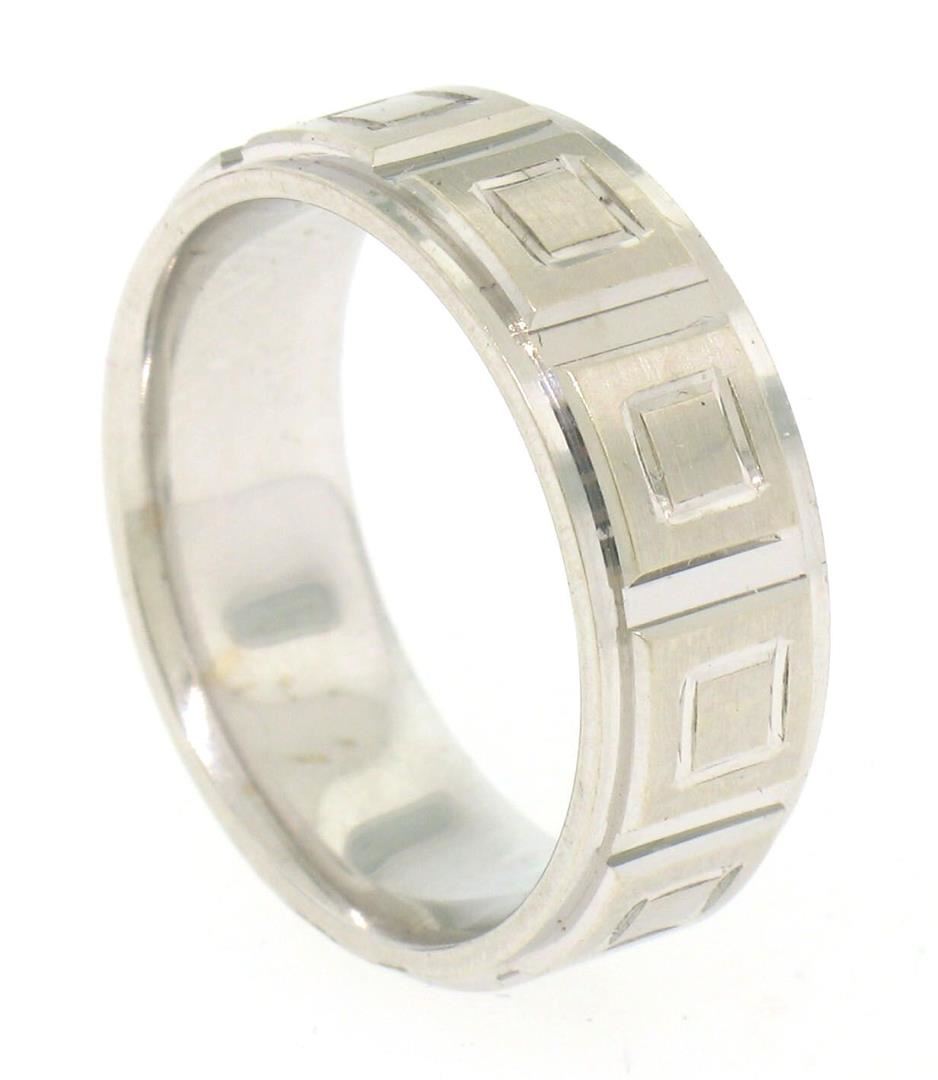 Men's 14k Solid White Gold Comfort Fit Dual Finish Coffered Band Ring Size 7. Please see photos and description for all available information. An estate solid 14k white gold coffered band ring, The ring is size 7.0, weighs a total of 8.30 grams, and measures 6.99mm wide.
