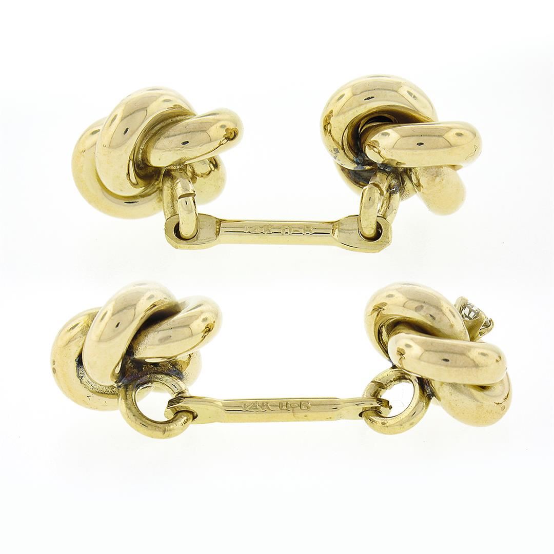 A solid 14k yellow gold knot cufflinks, with 2 round brilliant cut natural diamonds (F - VS2 ; 0.10ctw). These cuff links have a bar design with a clearance of 18.50mm, weigh a total of 7.15 grams, and the front panels measure in diameter10.30mm.
