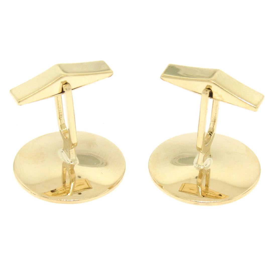 An estate 14k yellow gold concave swirl cufflinks, These cuff links have a swivel design with a clearance of 14.50mm, weigh a total of 11.1 grams, and the front panels measure 19.92mm in diameter.