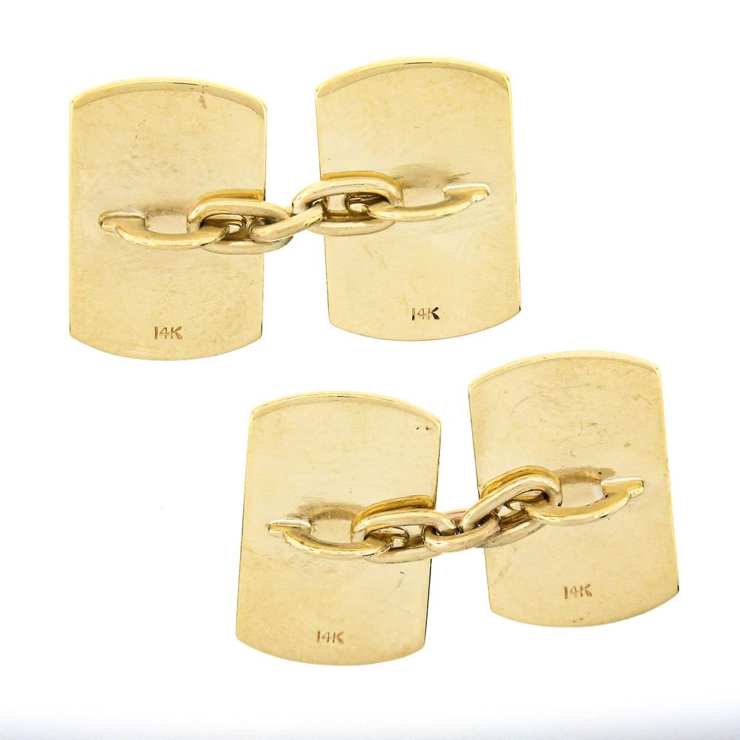 A solid 14k yellow gold cufflinks. These cuff links have a chain link design with a clearance of 16mm, weigh a total of 10.56 grams, and the front panels measure 17.1x11.4mm.