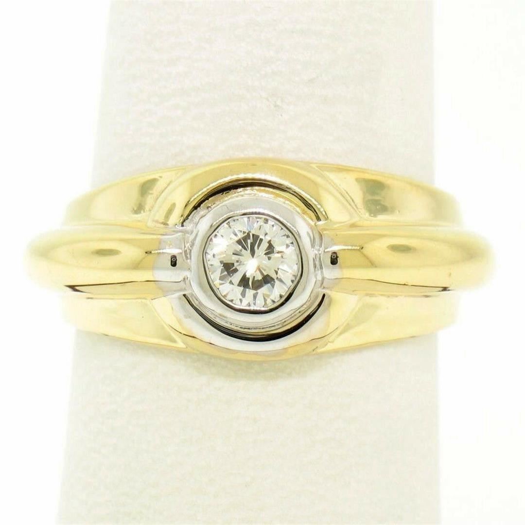 A like new men's 14k yellow gold band ring bezel set with a 0.40ct round diamond (F - SI1). The ring is size 7, weighs a total of 6.4 grams, and measures 9.55mm wide.