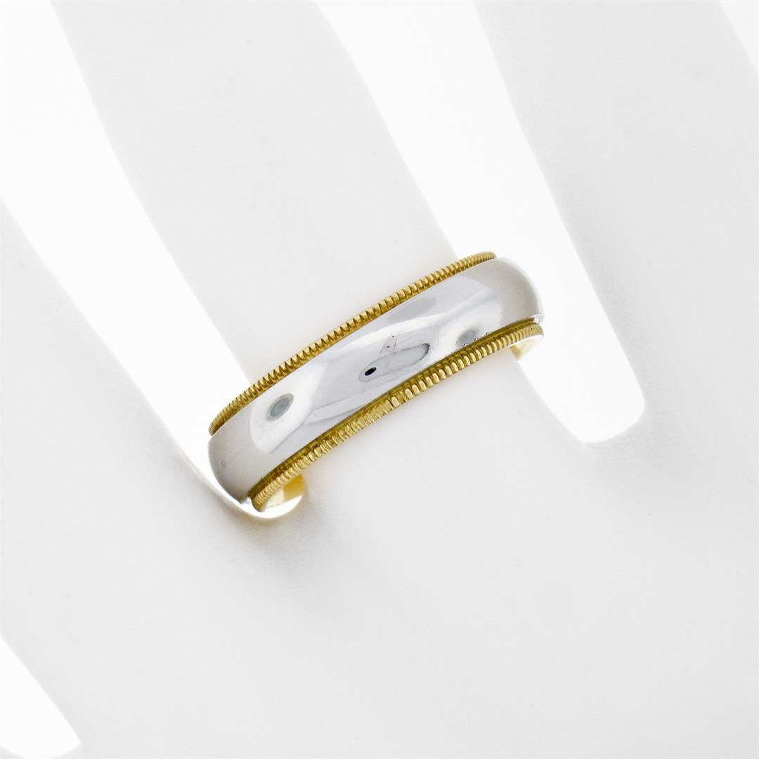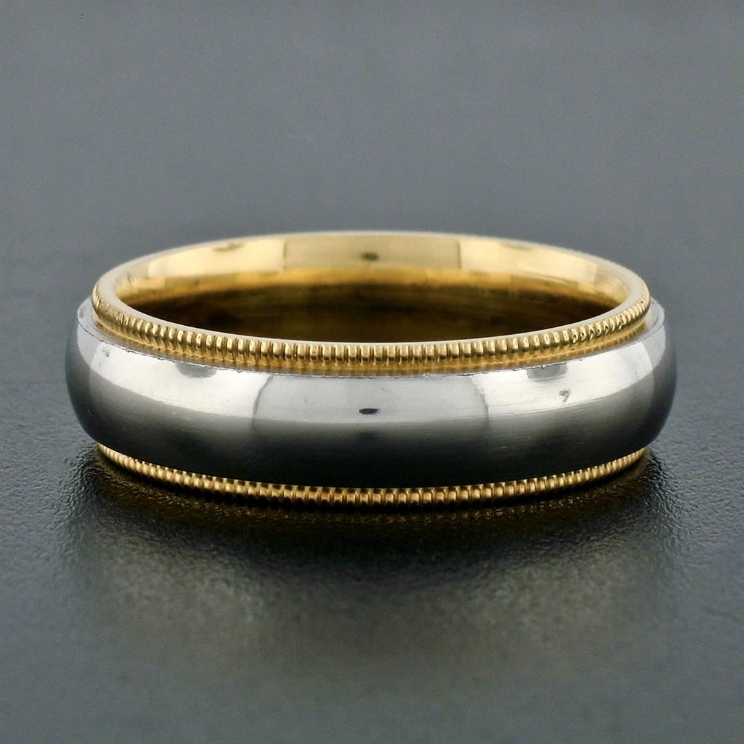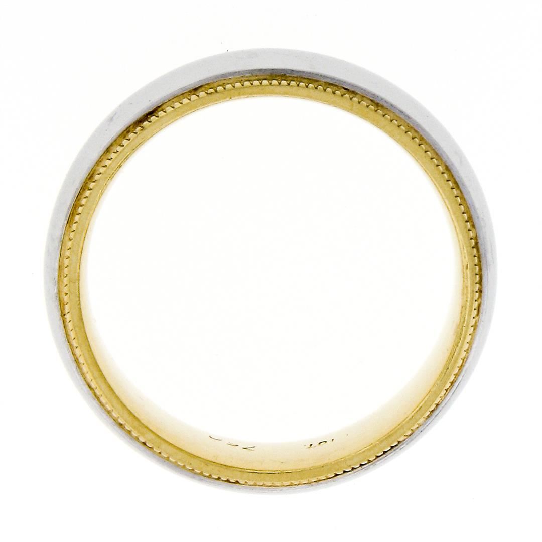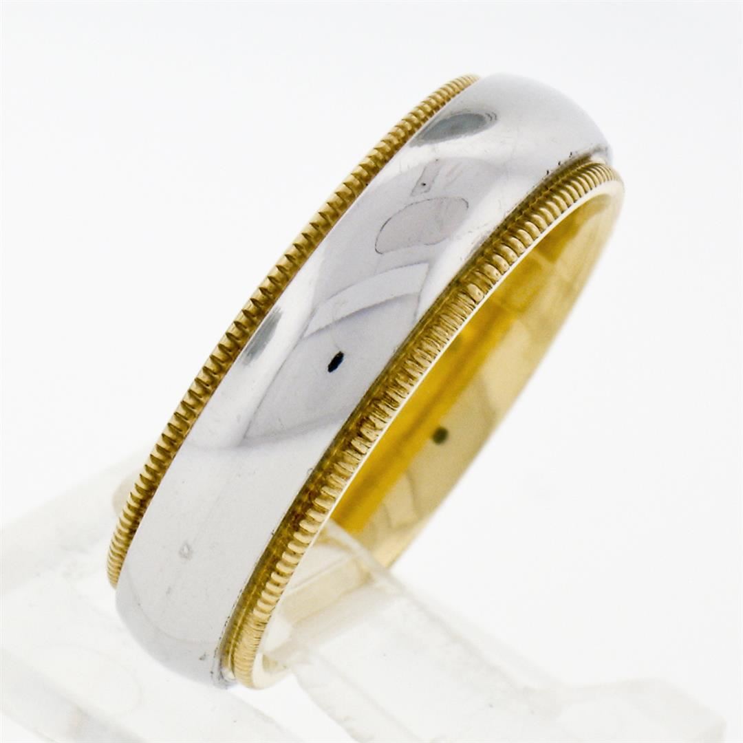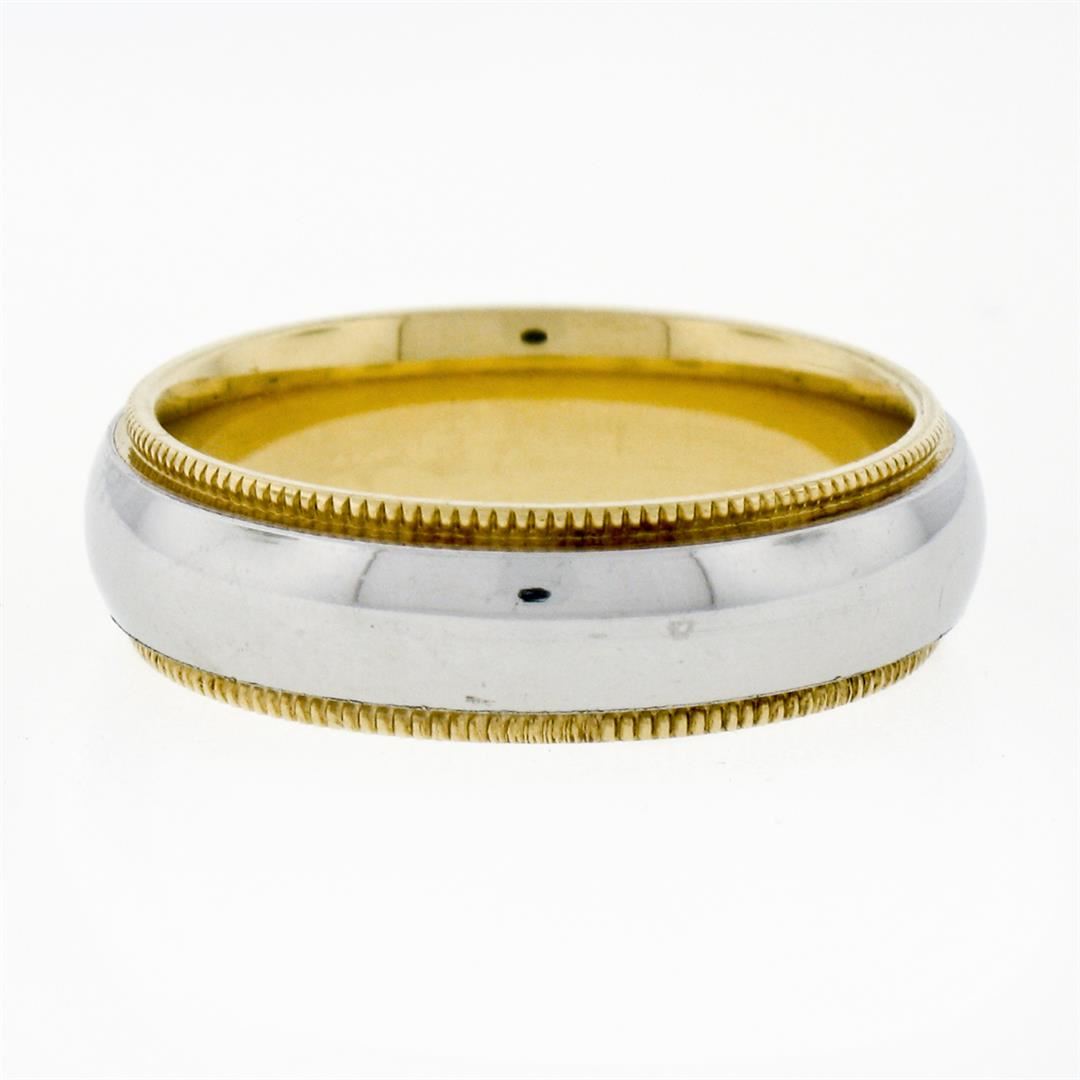 An 18k white and yellow gold men's wedding band ring with a domed center and milgrain etched edges. The ring is size 6.5, weighs a total of 8.47 grams, and measures 5.5mm wide.