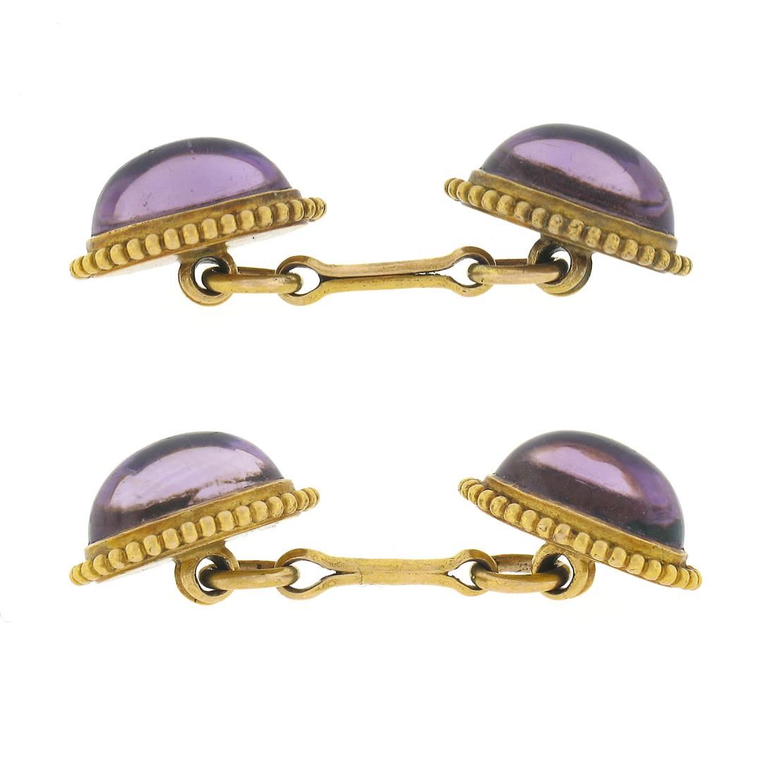 An antique solid 14k yellow gold cufflinks, with 4 oval cabochon cut natural amethysts (10.3x7mm each). These cuff links have a chain design with a clearance of 19mm, weigh a total of 6.04 grams, and the front panels measure 12.9x9.75mm.