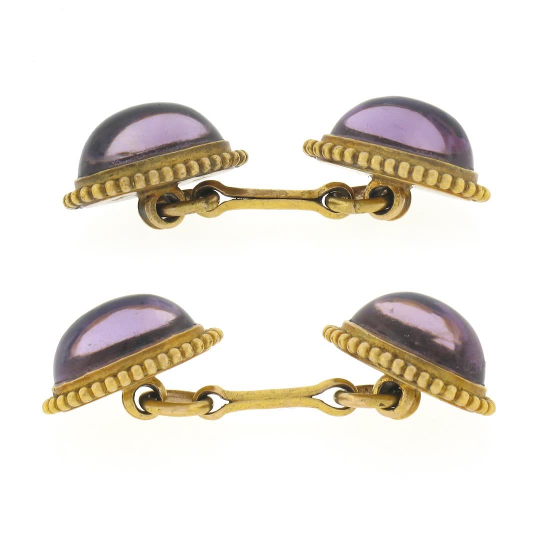 An antique solid 14k yellow gold cufflinks, with 4 oval cabochon cut natural amethysts (10.3x7mm each). These cuff links have a chain design with a clearance of 19mm, weigh a total of 6.04 grams, and the front panels measure 12.9x9.75mm.