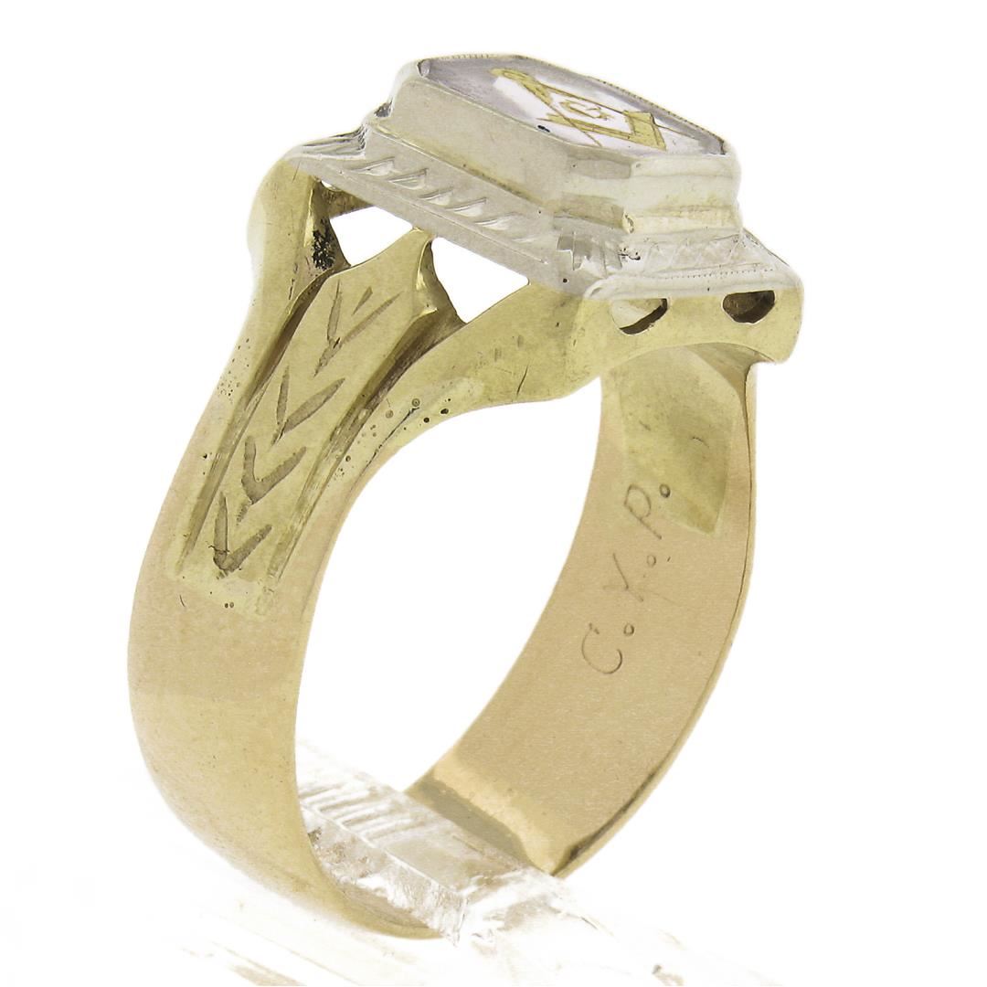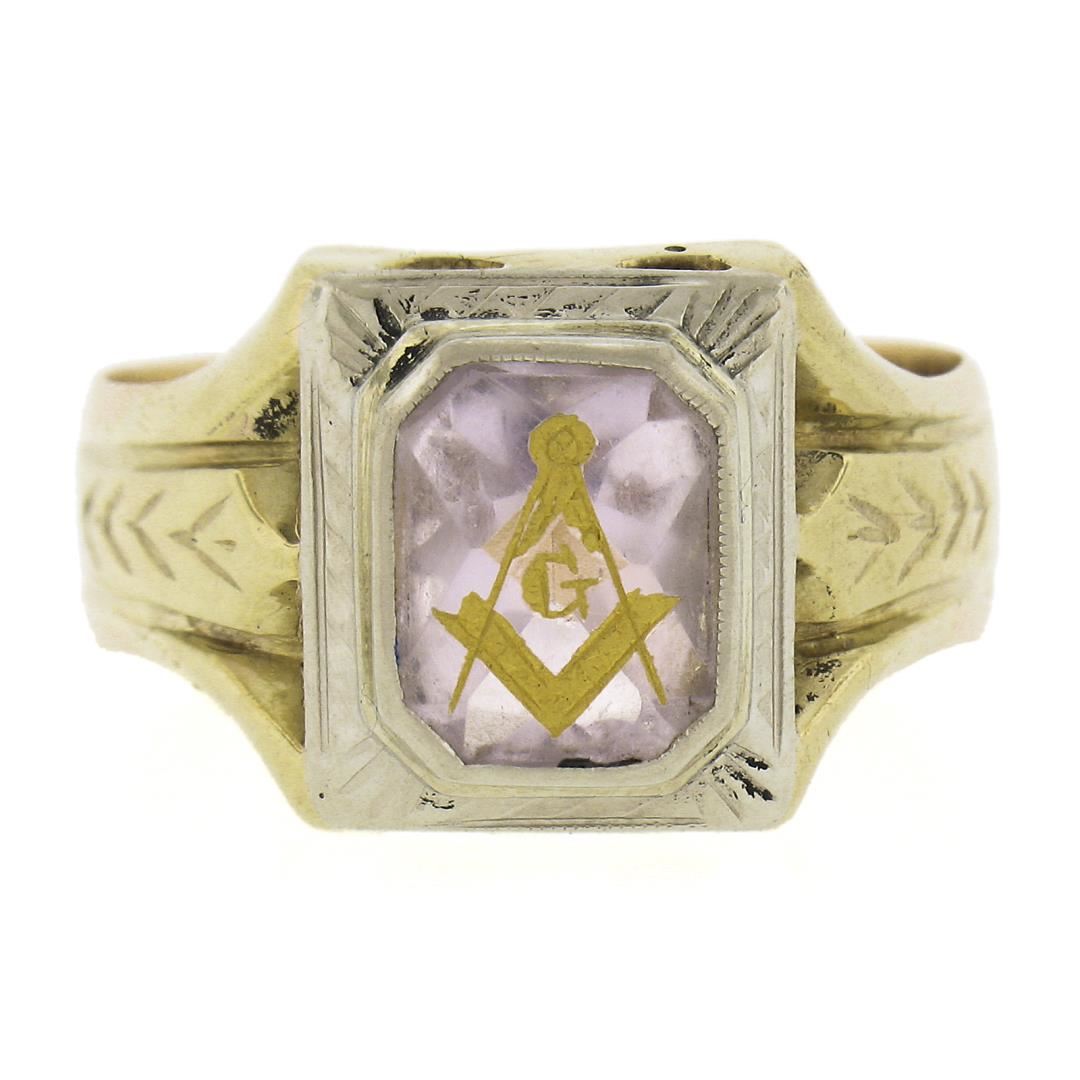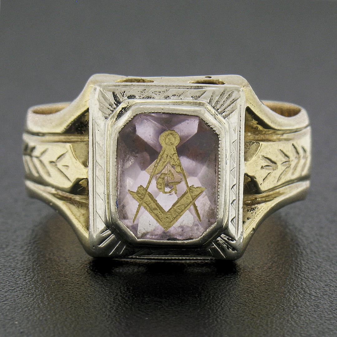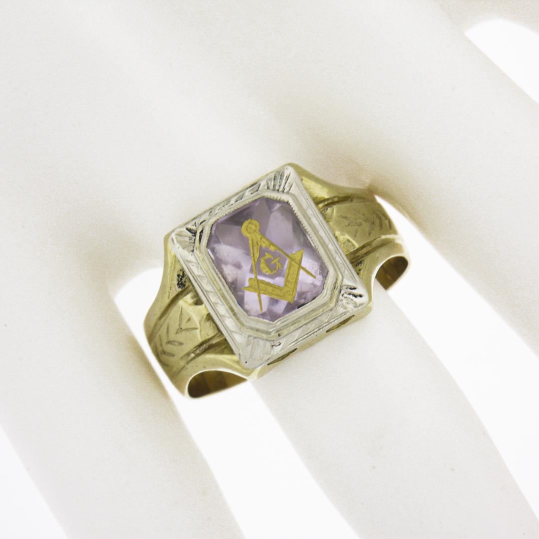 An antique solid 14k yellow & white gold men's masonic ring, with 1 rectangular cut natural amethyst (9.5x7.9mm). The ring is size 12, weighs a total of 7.43 grams, and measures 14mm wide.