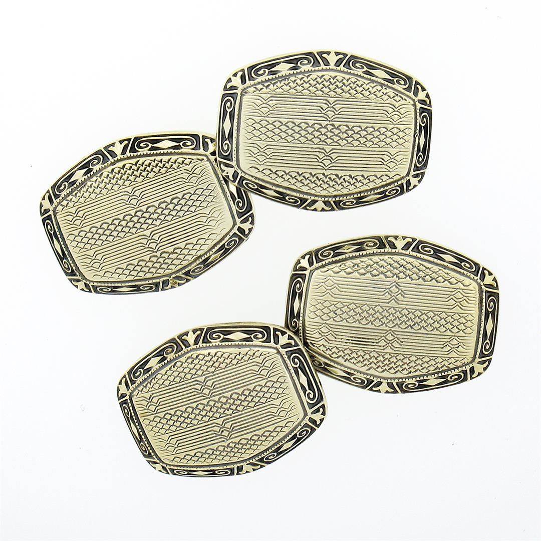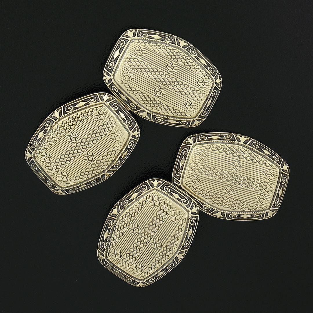 An antique solid 14k yellow gold etched engraved cufflinks. These cuff links have a linking bar design with a clearance of 15.10mm, weigh a total of 6.0 grams, and the front panels measure 16.6x12.5mm.