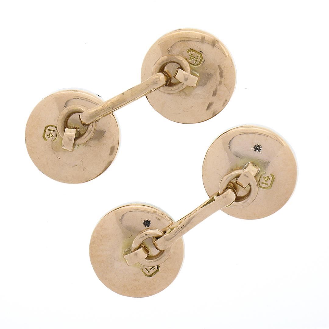 An antique solid 14k rosy yellow gold and platinum cufflinks, with 4 round shape mother of pearls (10.8mm). These cuff links have a linking bar design with a clearance of 14.70mm, weigh a total of 6.34 grams, and the front panels measure 11.75mm.
