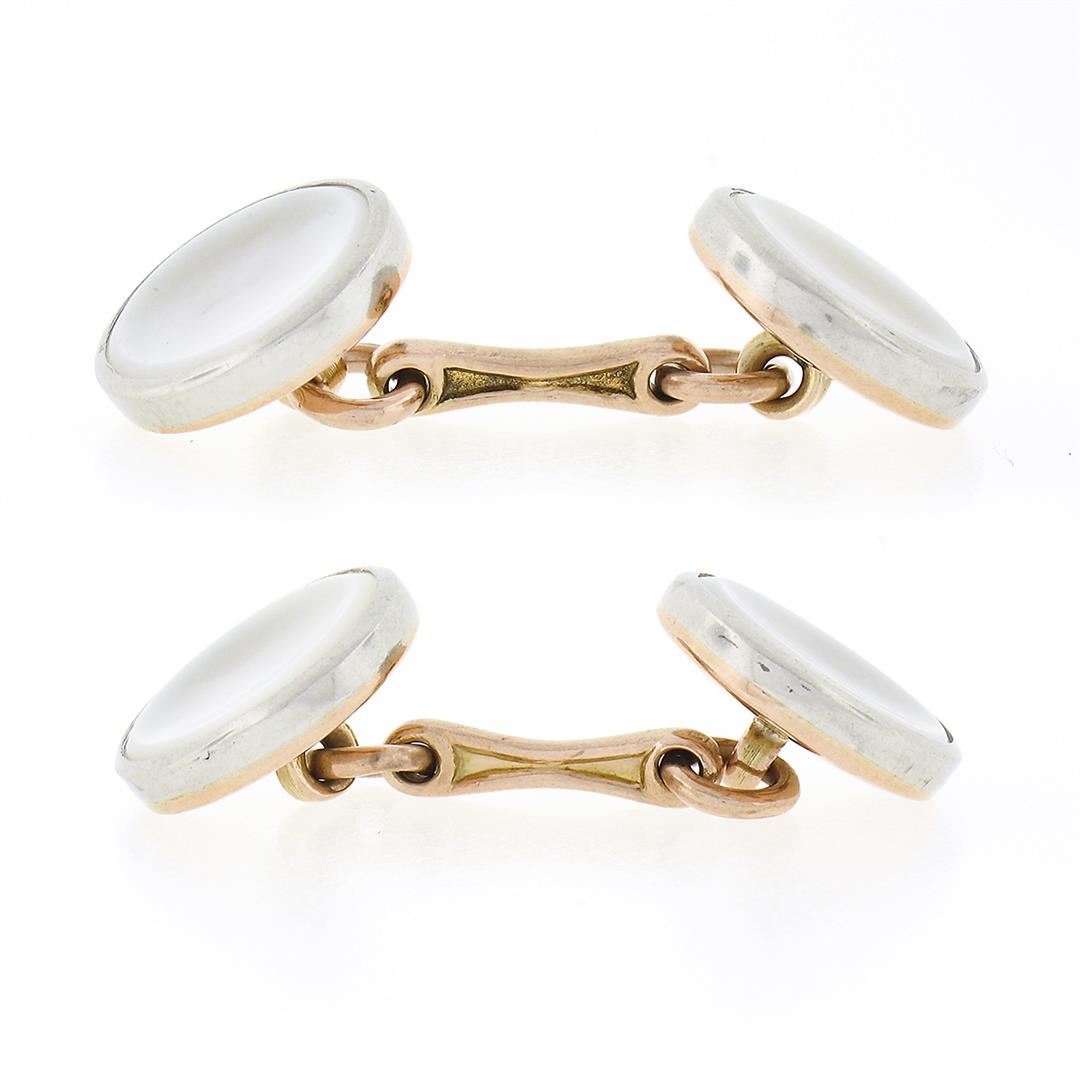 An antique solid 14k rosy yellow gold and platinum cufflinks, with 4 round shape mother of pearls (10.8mm). These cuff links have a linking bar design with a clearance of 14.70mm, weigh a total of 6.34 grams, and the front panels measure 11.75mm.