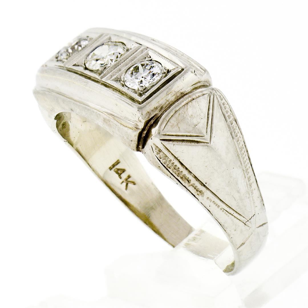 An antique solid 14k white gold men's band ring, with 3 old european cut natural diamonds (G/H- VVS2/VS1; 0.75ctw). The ring is size 11.5, weighs a total of 9.13 grams, and measures 9.60mm wide.