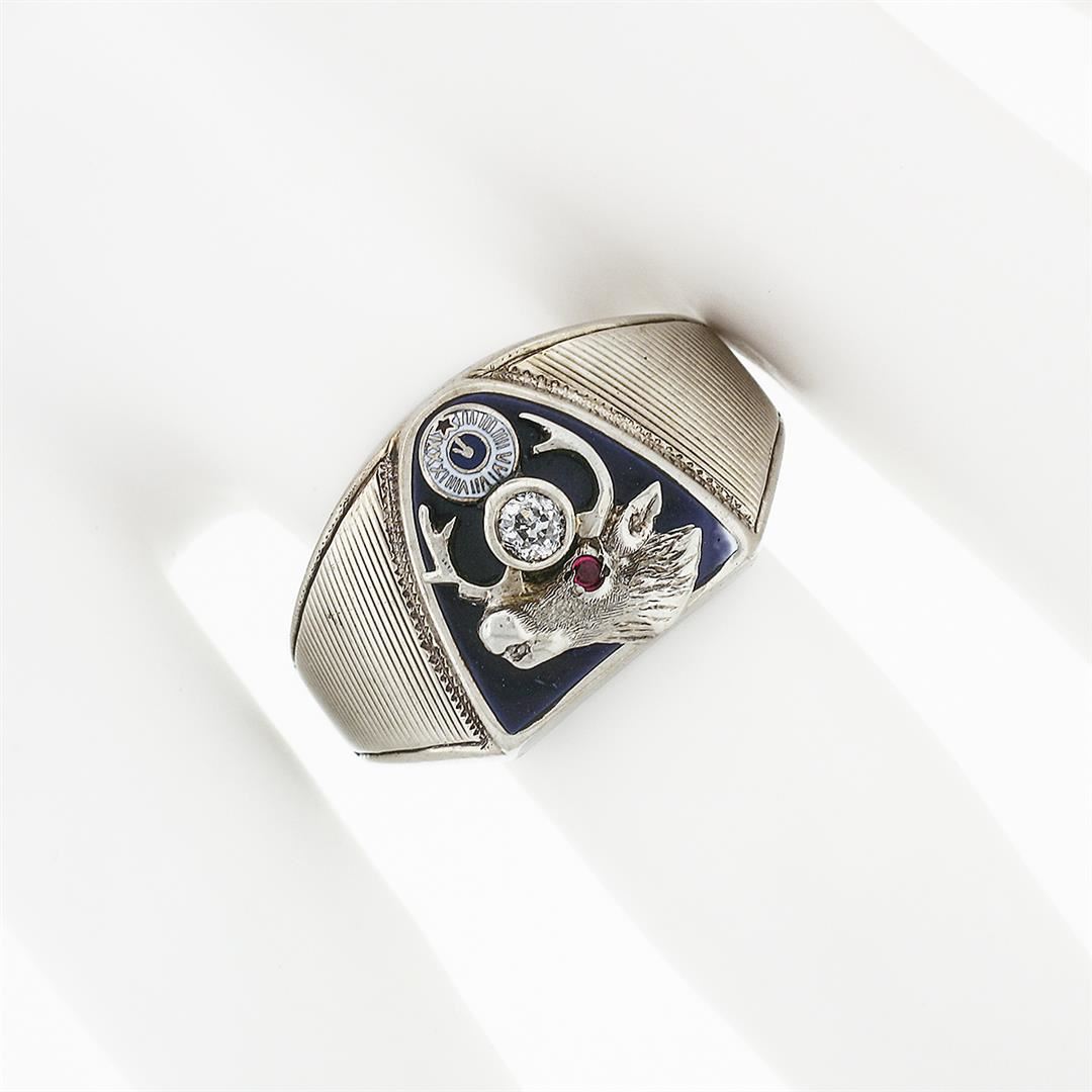 An antique solid 14k white gold elk moose ring, with enamel work & 1 old mine cut natural diamond (H- SI1; 0.14ct), & round cut natural ruby (0.03ct ). The ring is size 9.5, weighs a total of 12.02 grams, and measures 13.34mm wide.