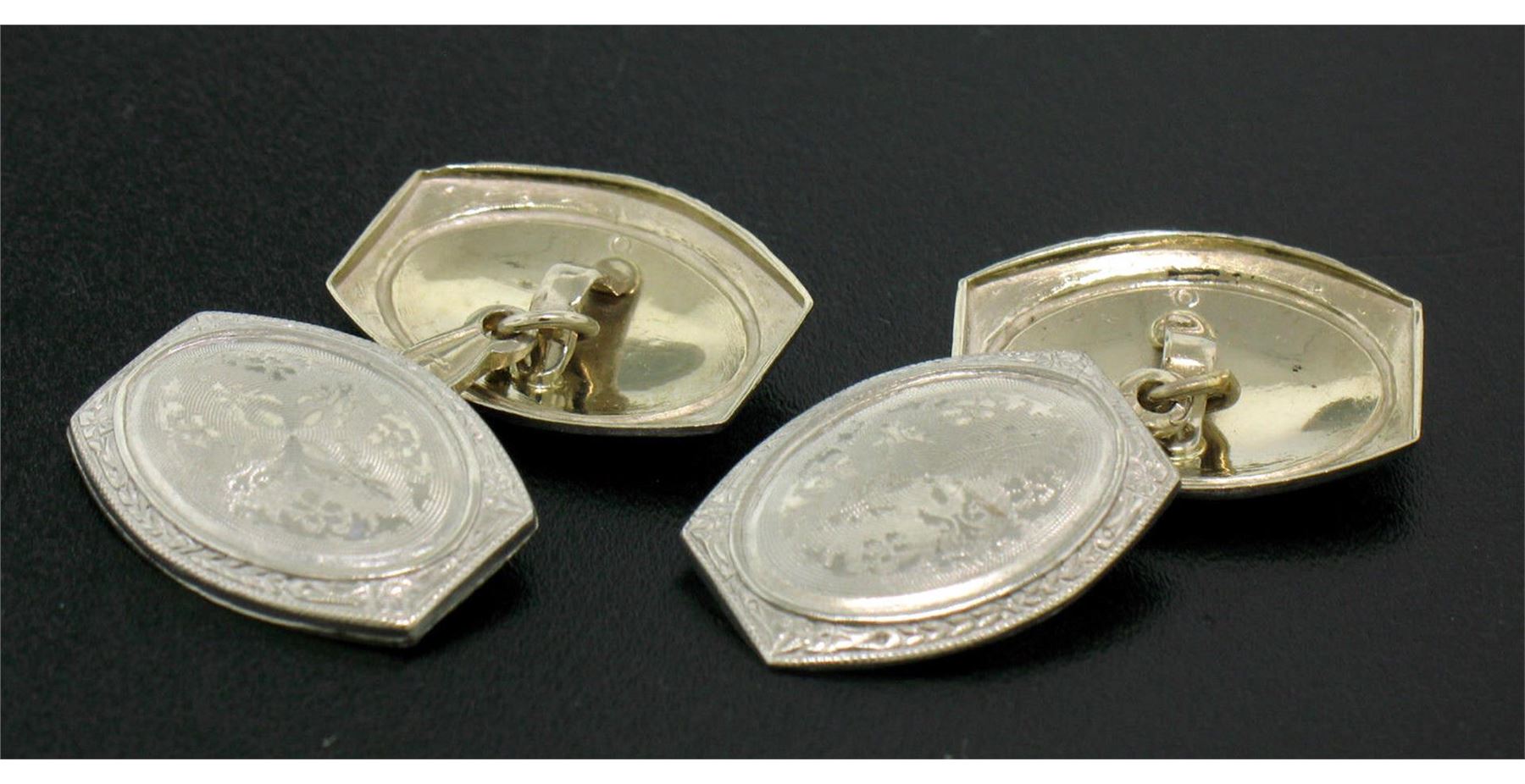 An antique solid 14k white gold damask etched oval panel Cufflinks, These cuff links have a linking bar design, weigh a total of 4.0 grams, and the front panels measure 12.28x16.72mm.