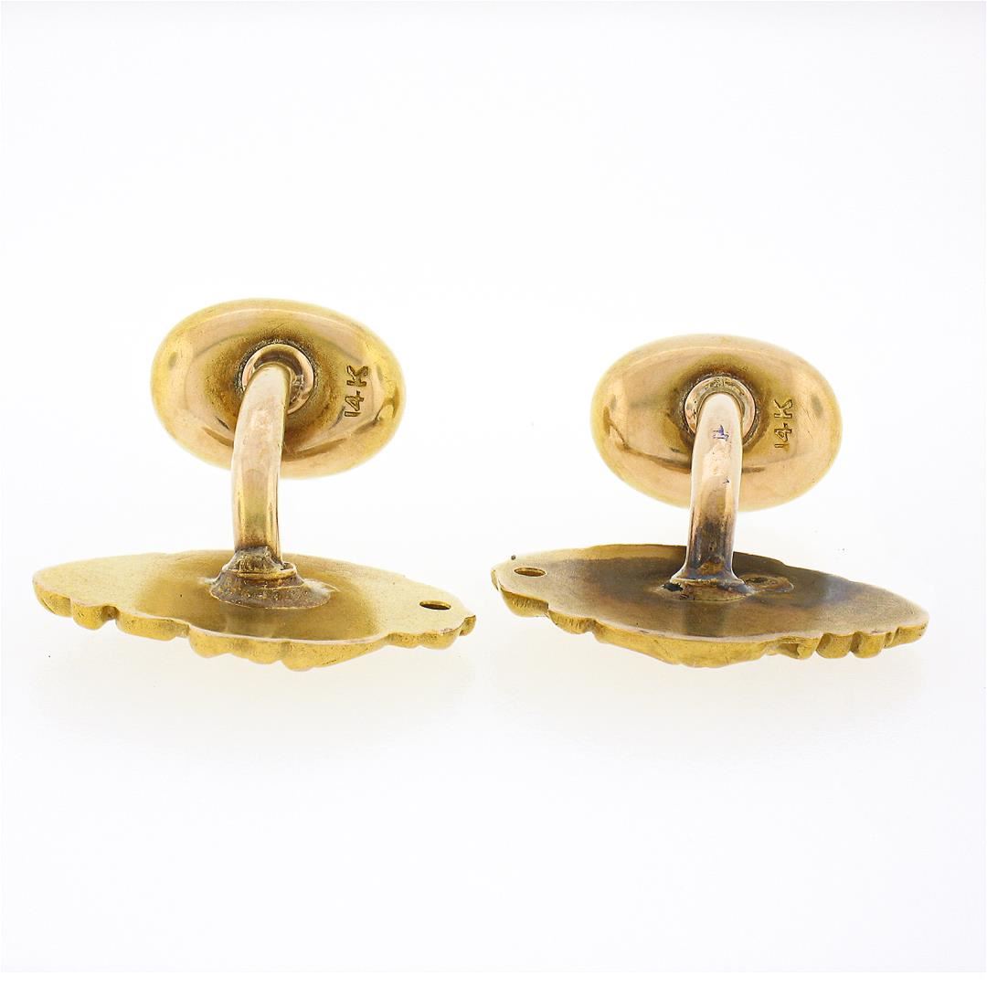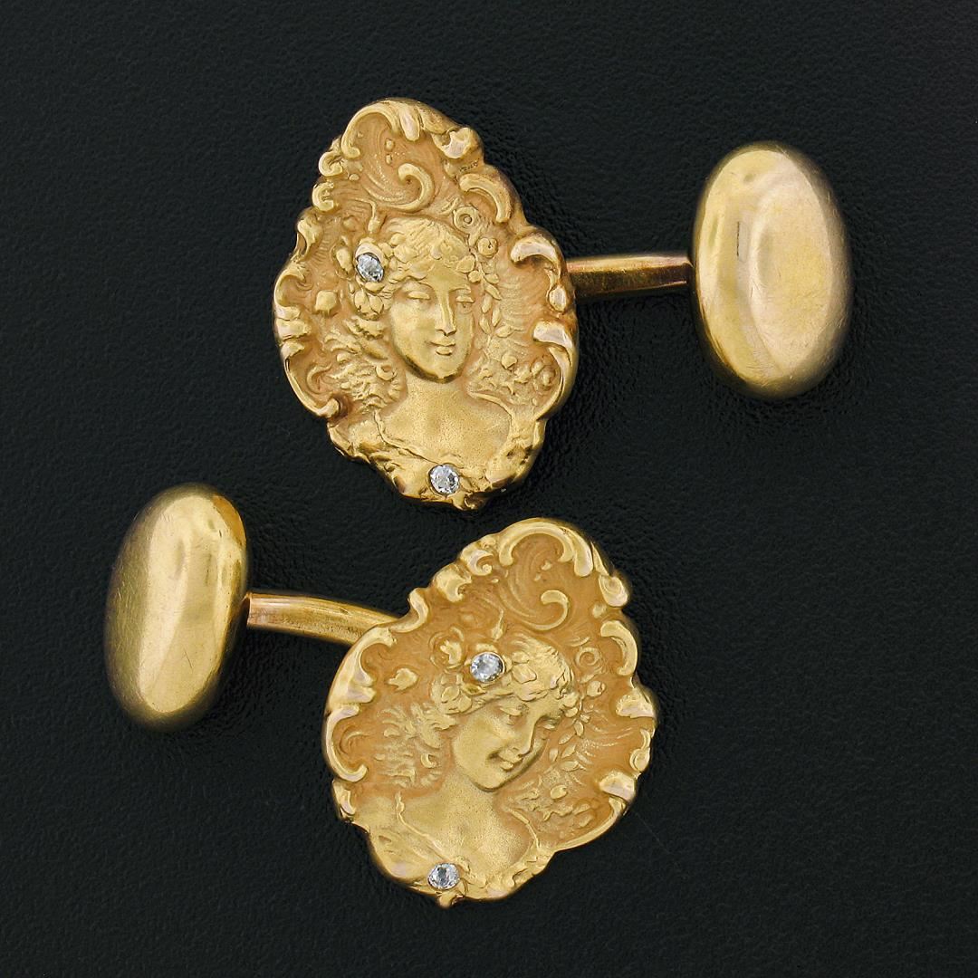 An antique solid 14k yellow gold men's cufflinks, featuring 4 old single cut natural diamonds (G/H - VS2/SI1 ; 0.04ctw). These cuff links have a fixed back design with a clearance of 7mm, weigh a total of 5.18 grams, and the front panels measure 18.70x14.9mm.